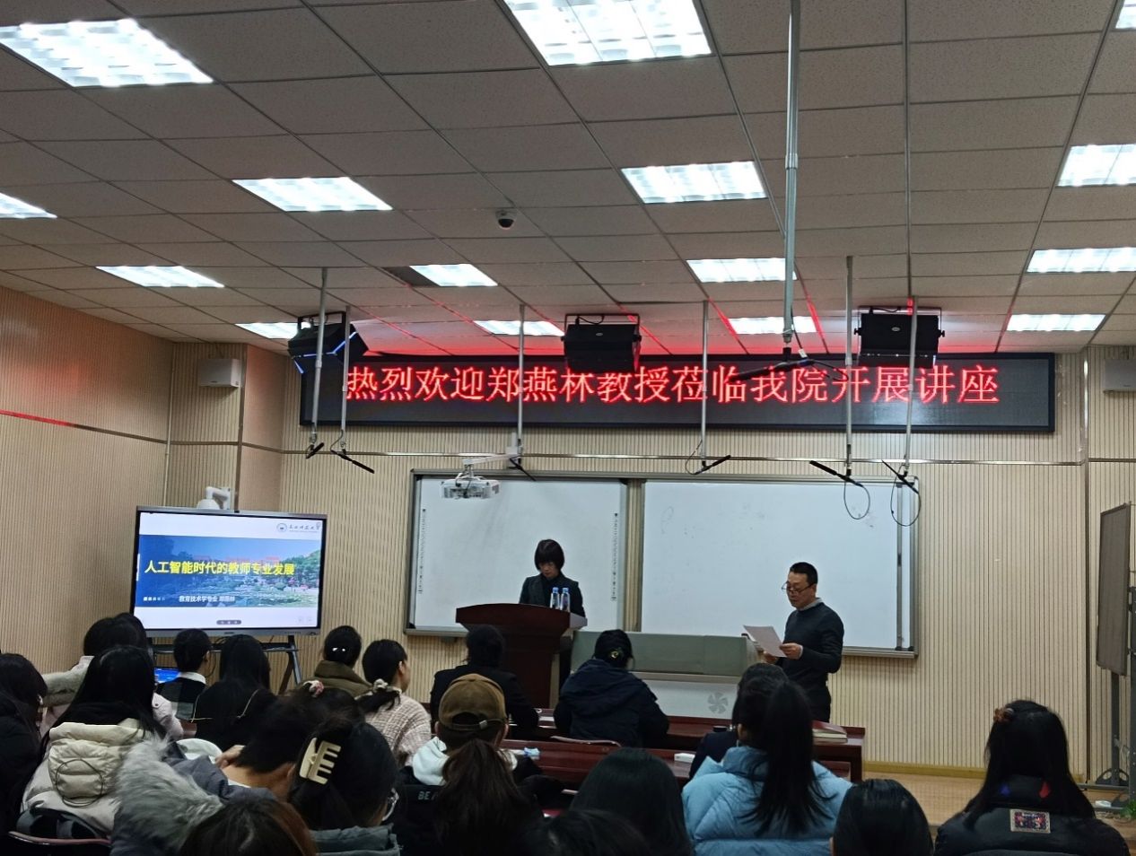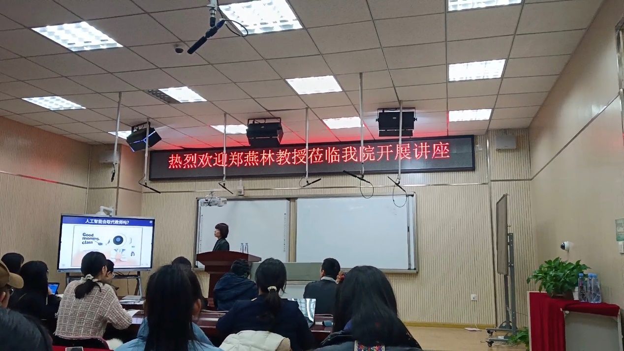 12月6日上午,东北师范大学信息科学与技术学院党委书记、博士生导师郑燕林教授应我校教育科学学院邀请,在社科楼213室作题为《人工智能时代的教师专业发展》的学术讲座。讲座由教育科学学院院长陈云奔主持,教育技术学、现代教育技术专业的教师及硕博研究生们参加活动。