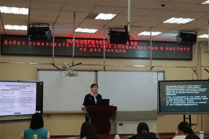 卡尔纳乌赫的报告重点梳理了欧洲与俄罗斯大学教育发展史脉络,同时深入剖析俄罗斯高校教师培养的历史沿革与模式、大学科研活动的组织与创新,以及学生教育工作的开展和俄罗斯整体教育体系的特征。她以深厚的学术功底和生动的讲解方式,引导学生全面领略欧洲与俄罗斯大学教育体系的繁荣进程与人才培养经验,使在场师生获得了深度启示与学术启发。