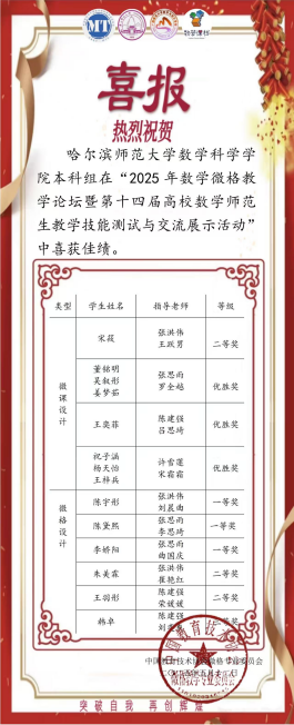 在微课设计类别中,宋筱(指导教师:张洪伟、王跃男)荣获二等奖;董铭明、吴叙彤、姜梦茹(指导教师:陈建强、吕思琦),王奕菲(指导教师:张思雨、罗全越),祝子涵、杨天怡、王梓兵(指导教师:许雪莲、宋霜霜)八位同学荣获优胜奖。