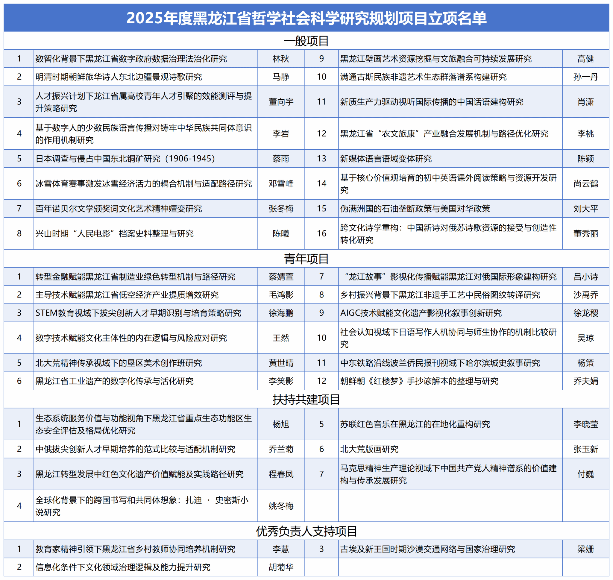 近日,黑龙江省哲学社会科学工作办公室公布了《2025年度黑龙江省哲学社会科学研究规划项目拟立项名单》,我校此次共获批省社科项目38项,其中一般项目16项、青年项目12项、扶持共建项目7项、优秀负责人支持项目3项。