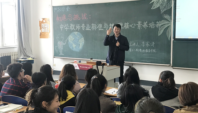 李家清教授基于教师队伍建设改革进入新时期迈向新高度、新颁布的师范毕业生认证要求和基础教育课程改革走向深水区的时代大背景,从教师专业发展的时代背景、教师专业培养的能力结构、地理核心素养的基本取向、地理核心素养的培养路径四个方面展开讲座内容。李家清首先向同学们征集问题,并以此为开端,从地理专业的概况以及我国地理学科的现状出发,与同学们展开探讨,充分调动了同学们的兴趣与积极性,带领同学们进入本次讲座的主题。李家清向大家介绍了教师队伍建设改革进入新时期、迈向新高度的背景,指出教育发展规划纲要目标任务的实现需要建设一支“师德高尚,业务精湛,结构合理,充满活力”的教师队伍;在师范大学不断面临新的挑战的局面下,师范毕业生必须具备较强的学习能力以及创新能力。