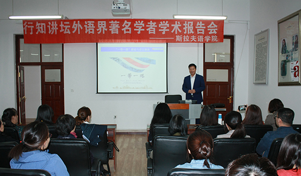 (徐涛/文)4月22日下午,外国语言文学一级学科的师生共同迎来了天津外国语大学前副校长、博士生导师、天津外国语学院王铭玉教授和他带来的“‘一带一路’建设与语言服务”专题学术报告会。社科楼903室学术报告厅座无虚席,来自黑龙江大学俄语学院、哈尔滨师范大学斯拉夫语学院、西语学院、东语学院和公共外语教研部的师生70余人聆听了王铭玉教授历时两个多小时的精彩演讲,报告会由我校外国语言文学一级学科带头人赵秋野教授主持。