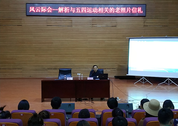 臧伟强教授作题为《风云际会——解析与五四运动相关的老照片信札》的专题报告。臧伟强理论功底深厚、研究成果丰富,整场讲座旁征博引,以大量的原版照、信札为依据,用马克思主义历史观对“五四”运动的成因、二十一条的谈判、巴黎和会中国外交的失利、中国签订《对德和约》的利弊及三个卖国贼的后事,作了较深入的讲解,向全场师生形象地、立体地再现一百年前这段风云际会的史实。