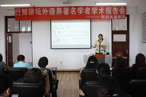 (李颖/文)6月17日,斯拉夫语学院及外国语言文学一级学科博士点特邀中央民族大学中国少数民族语言文学学院教授、比较文学与世界文学中心负责人、博士生导师汪立珍教授在我校社科楼斯拉夫语学院903学科中心做了题为《多元一体的中华民族神话》的专题报告。来自我校斯拉夫语学院、西语学院、东语学院、文学院和历史文化学院等多个学院的师生共60余人聆听了讲座。讲座由比较文学与跨文化交际方向带头人张志军教授主持。