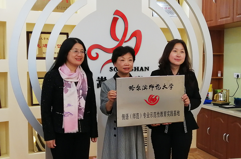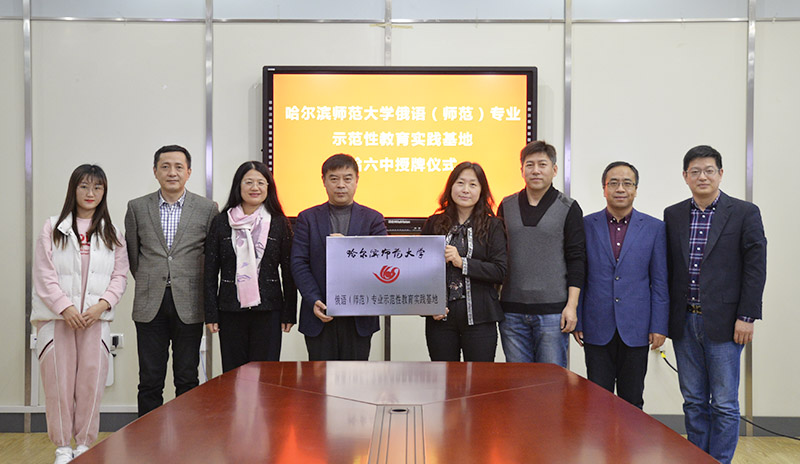 (张金忠/文)为提高我校俄语(师范)专业学生的从师技能,为学生开展教育实践搭建更加巩固的实训平台,加强高校与中学在教育教学领域的深度合作,深入贯彻落实我校确立的G-U-S联合人才培养理念,11月7日下午,我校在哈尔滨市两所开设俄语的初中和高中——哈尔滨市嵩山中学校和哈尔滨市第六中学校分别举行“俄语(师范)专业示范性教育实践基地”授牌仪式。我校教师教学发展实训中心主任朱佳颖、斯拉夫语学院院长赵秋野和副院长张金忠,哈尔滨市第六中学校校长张祥洲、哈尔滨市嵩山中学校校长张玉娟、副校长徐丽等为俄语(师范)专业示范性教育实践基地共同授牌。