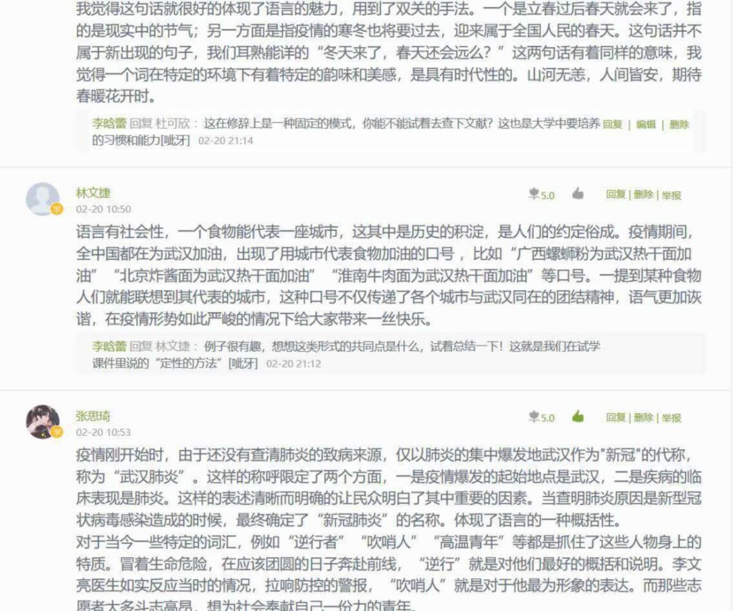 2017级汉语言文学五班张文颖:“线上课堂丰富有趣,看得出老师的用心准备,今天学到了很多,接下来会更努力,提升自己的知识水平。”