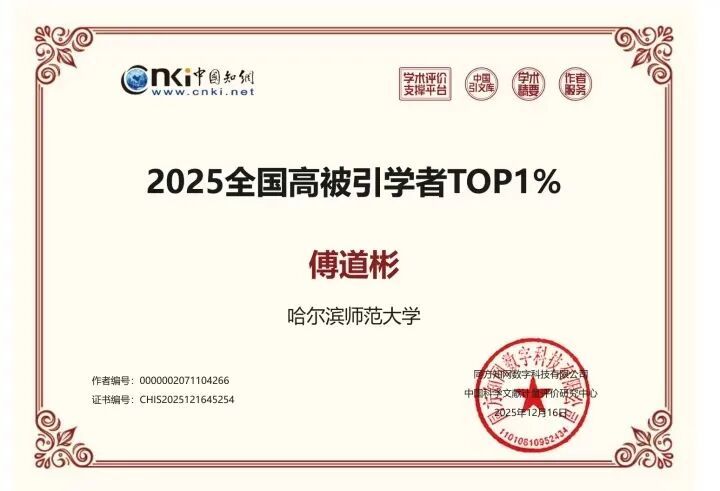近日,2025年“中国语言文学”一级学科中国知网高被引学者TOP1%名单正式揭晓。我校文学院傅道彬教授再度凭借其卓越的学术成就和广泛影响力,入选该名单。