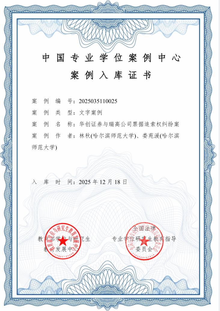 近日,全国法律专业学位研究生教育指导委员会公布第五批法律硕士专业学位文字教学案例入库名单,我校法学院副教授林秋与硕士研究生娄苑湲合作编写的《华创证券与瑞高公司票据追索权纠纷案》教学案例成功通过评审,被收录至“中国专业学位案例中心案例库”。
