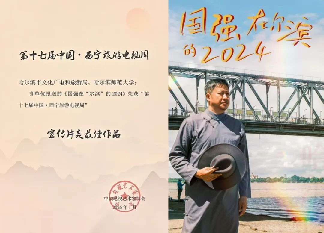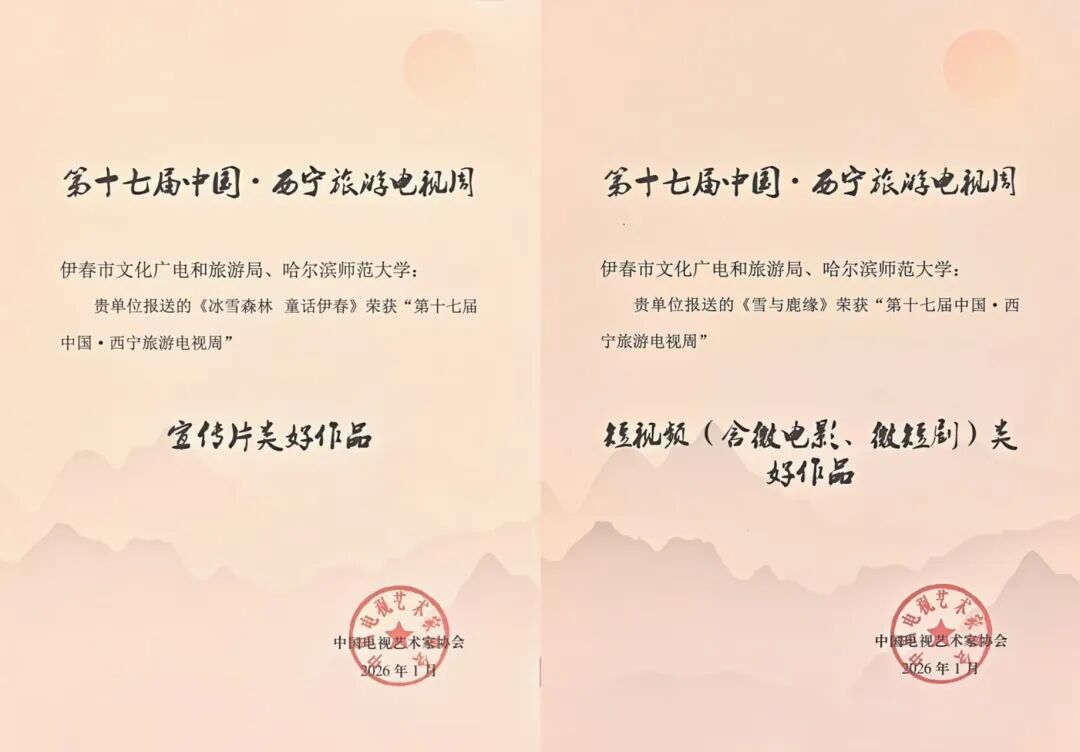 1月18日,由中国电视艺术家协会、西宁市人民政府主办,中国文联电视艺术中心、西宁市文化旅游广电局承办,中国视协文化旅游电视专业委员会、青海省电影电视艺术家协会协办的第十七届中国·西宁旅游电视周系列活动在青海省西宁市举办。由我校传媒学院副教授裴佳兴担任创意策划、副教授徐龙稷担任总导演、教师李焕达担任录音指导、教师王嘉熠担任航拍师、党委宣传部教师孙凌枫担任摄像师的作品《国强在尔滨的2024》《冰雪森林,童话伊春》《寻梦兴安》《雪与鹿缘》脱颖而出,分别荣获宣传片类“最佳作品”奖项、宣传片类“好作品”、短视频(含微电影、微短剧)类“好作品”奖项。
