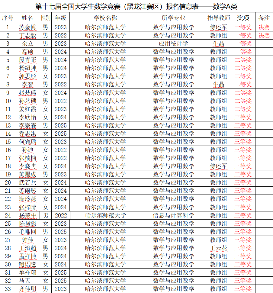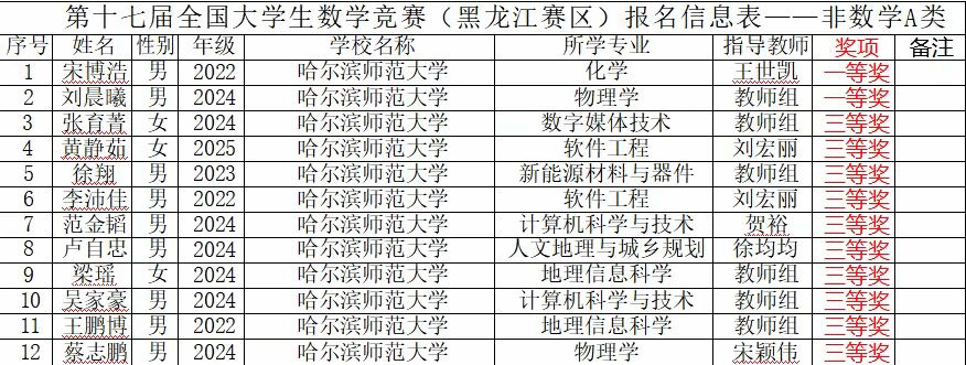 第十七届全国大学生数学竞赛黑龙江赛区数学A类获奖名单