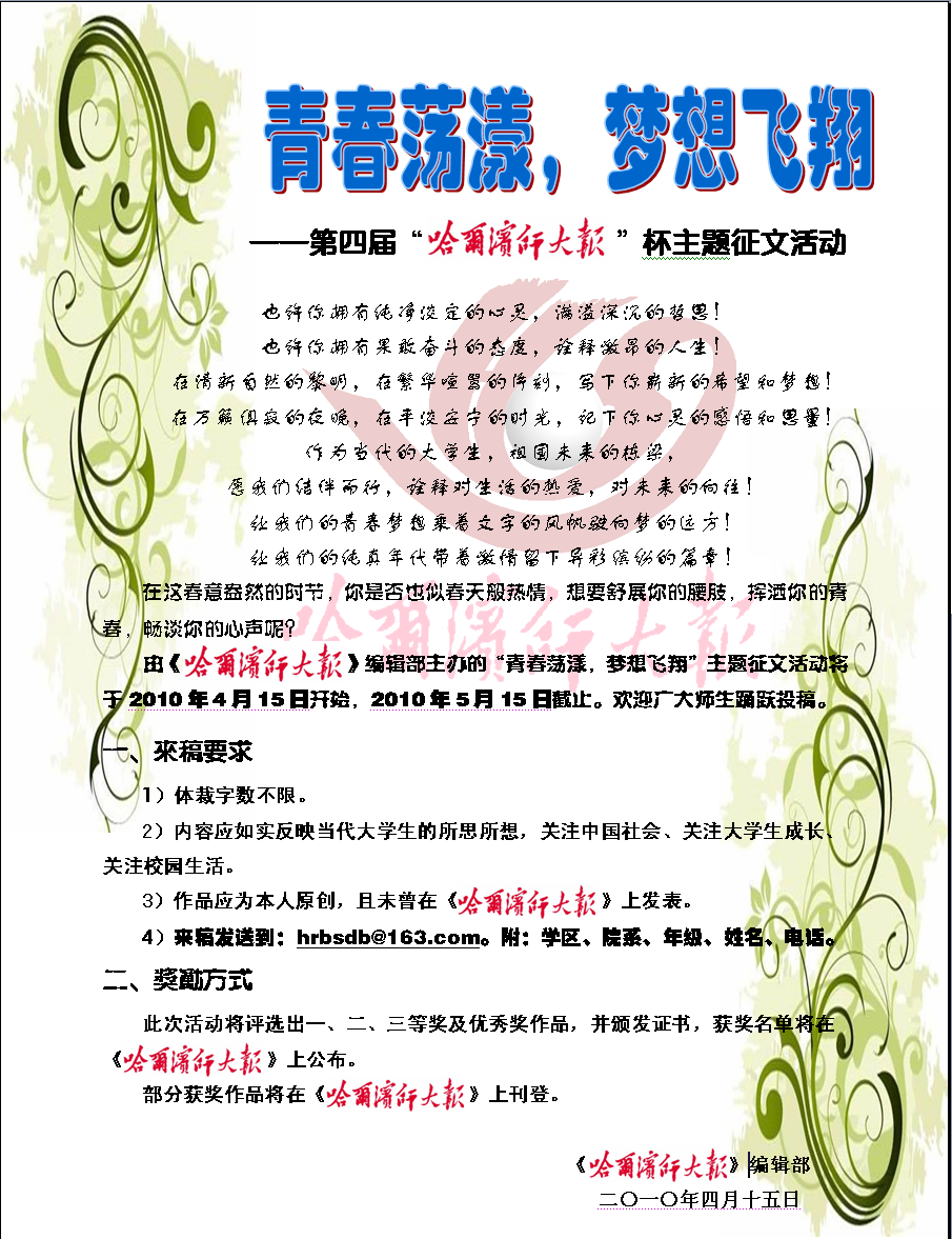 4)来稿发送到:hrbsdb@163.com。附:学区、院系、年级、姓名、电话。