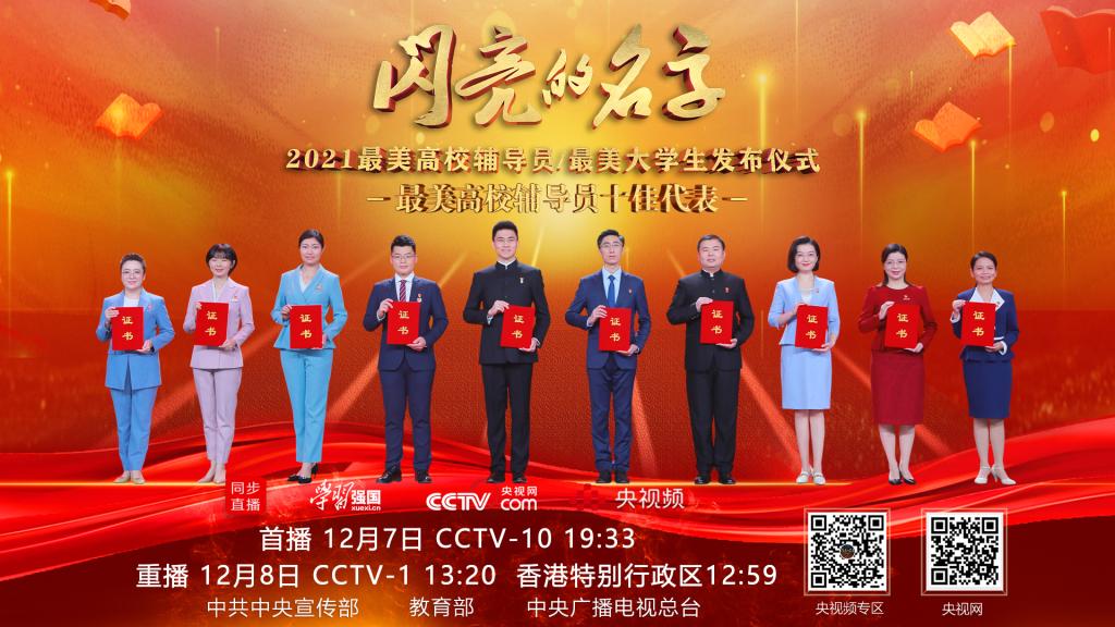 中央广播电视总台将于2021年12月7日在科教频道(CCTV-10)19:33首播,12月8日综合频道(CCTV-1)13:15、香港特别行政区12:59重播“闪亮的名字——2021最美高校辅导员/最美大学生发布仪式”。学习强国、央视网、央视频同步直播。