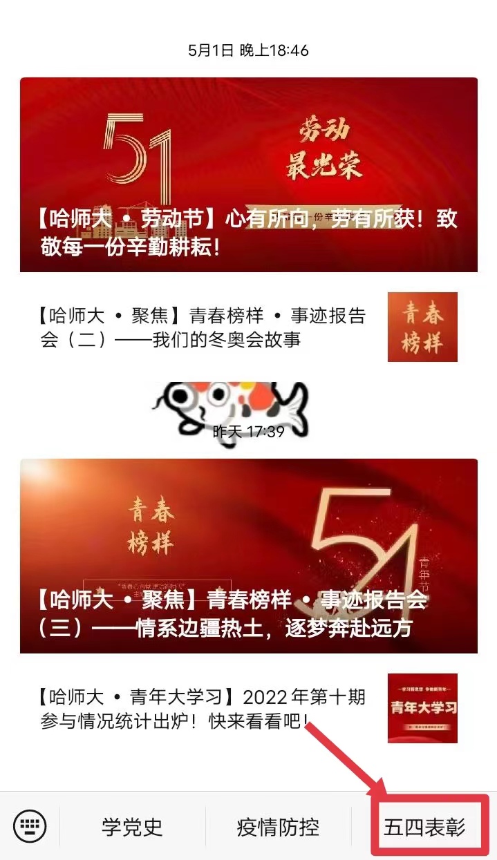 关注“哈师大青年”微信公众号,在公众号菜单栏中点击“五四表彰”即可收看。