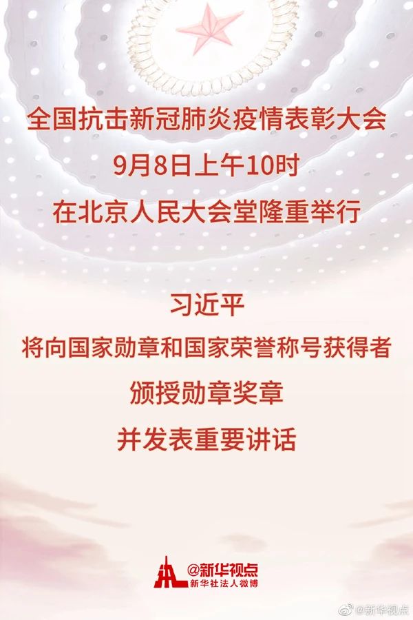 全国抗击新冠肺炎疫情表彰大会将于9月8日上午10时在北京人民大会堂隆重举行。******中央总书记、国家主席、中央军委主席习近平将向国家勋章和国家荣誉称号获得者颁授勋章奖章并发表重要讲话。
