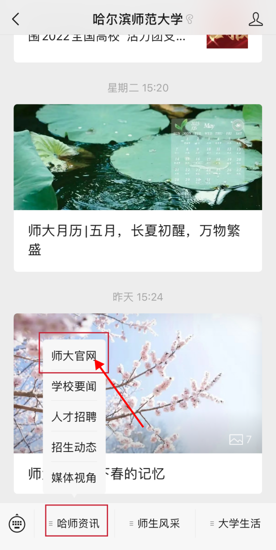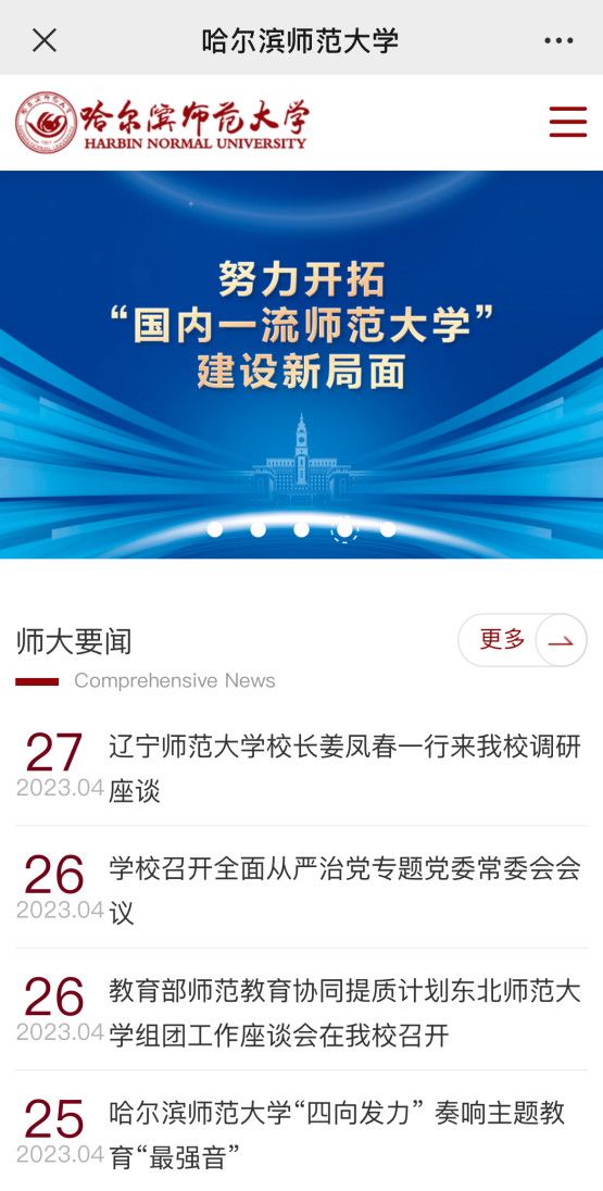 3.新网站建有移动客户端,用户可通过手机端查看新闻或消息,微信关注哈尔滨师范大学公众号后,主页点击“哈师咨讯”即可进入,进一步提高用户体验。