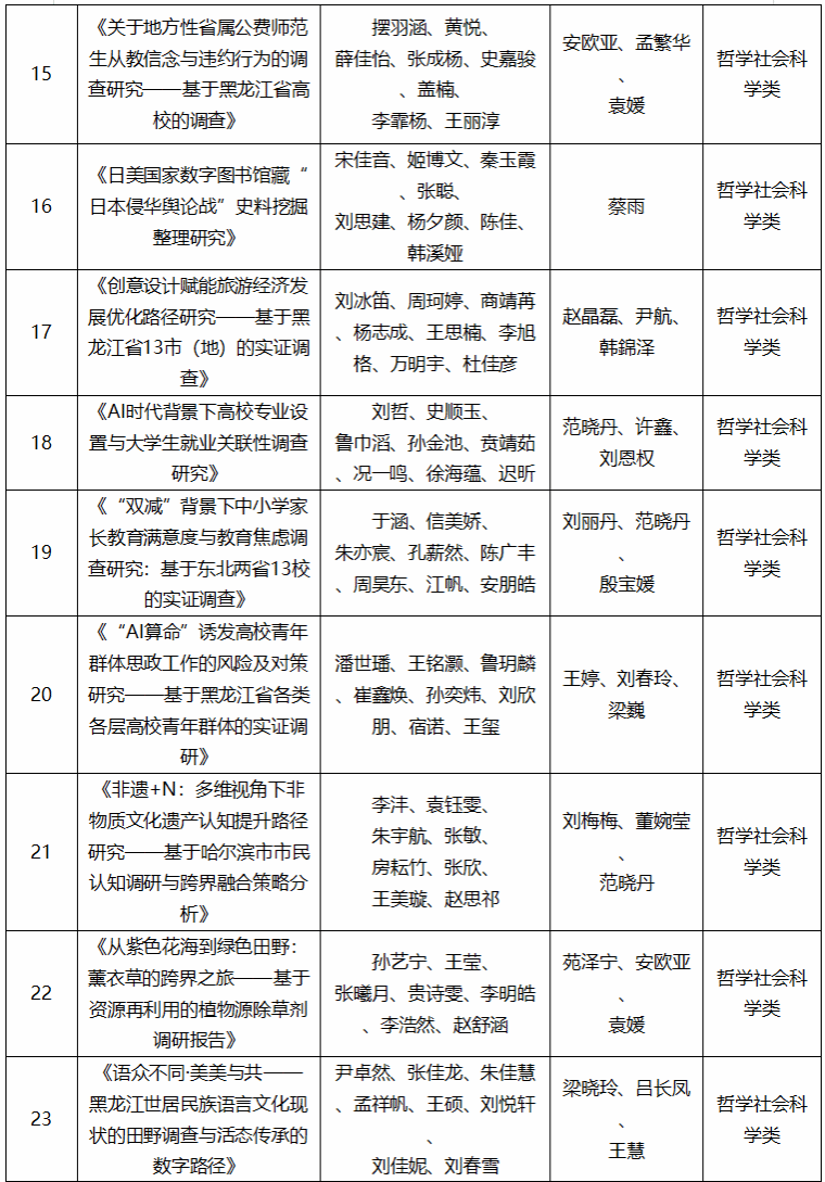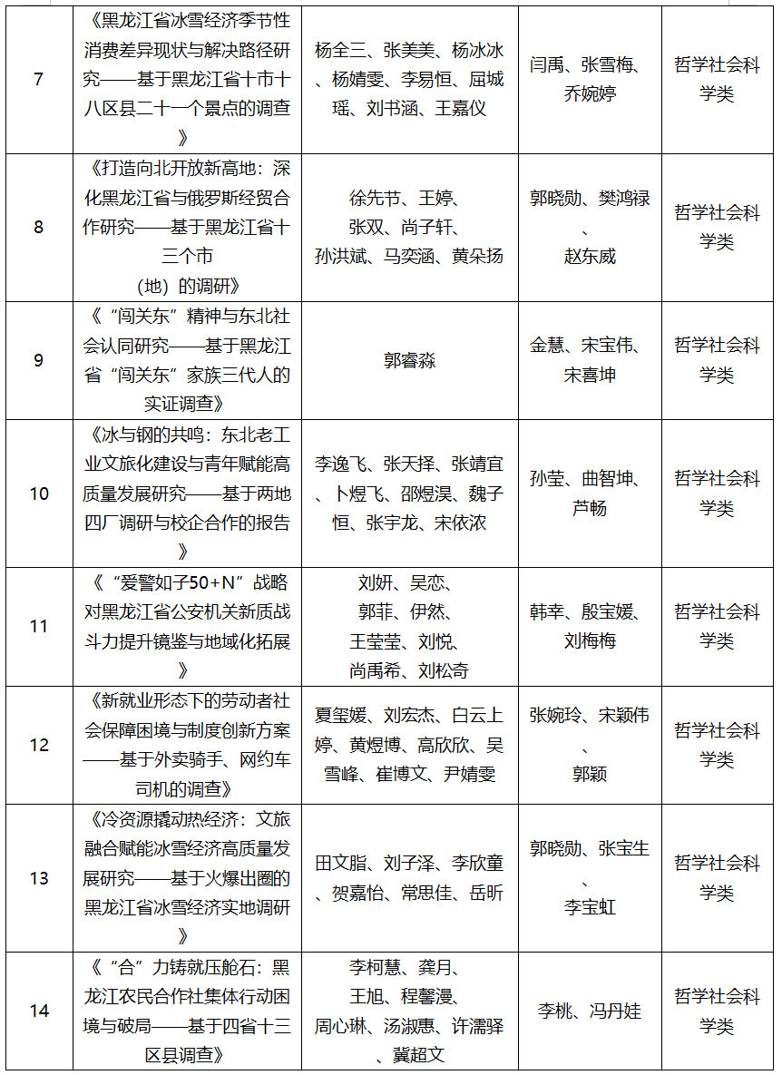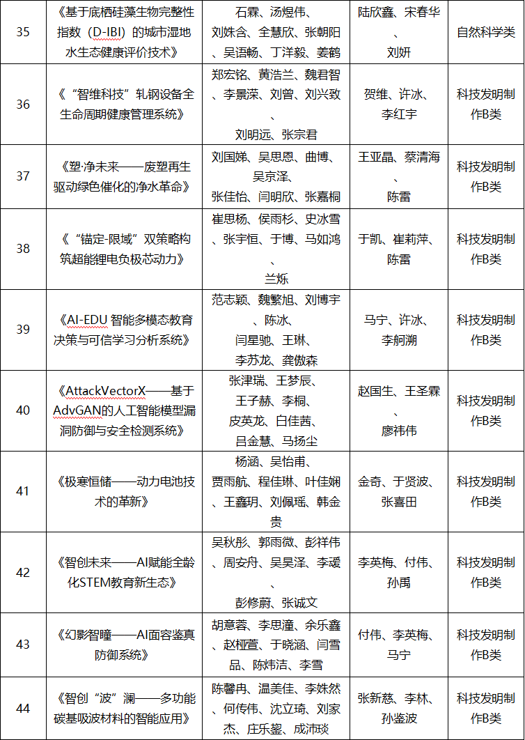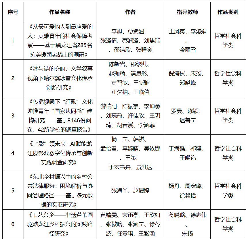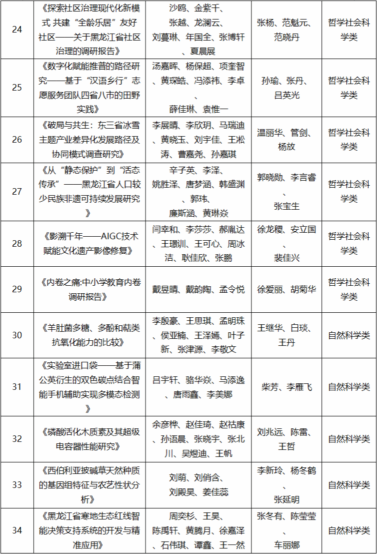 根据第十九届“挑战杯”黑龙江省大学生课外学术科技作品竞赛通知的相关要求,经个人申报、学院推荐、校赛复赛、校赛决赛等环节,我校拟推报以下50件作品作为2025年第十九届“挑战杯”黑龙江省大学生课外学术科技作品竞赛省赛推荐作品,现予以公示(排名不分先后,名单如下):