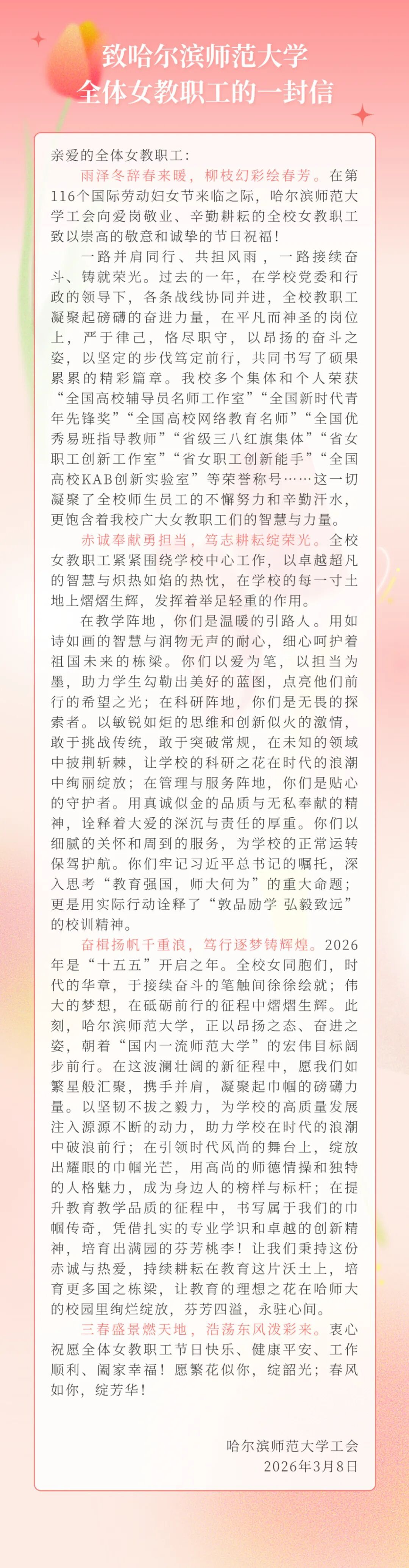致哈尔滨师范大学全体女教职工的一封信