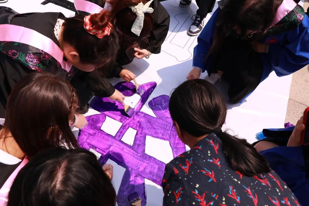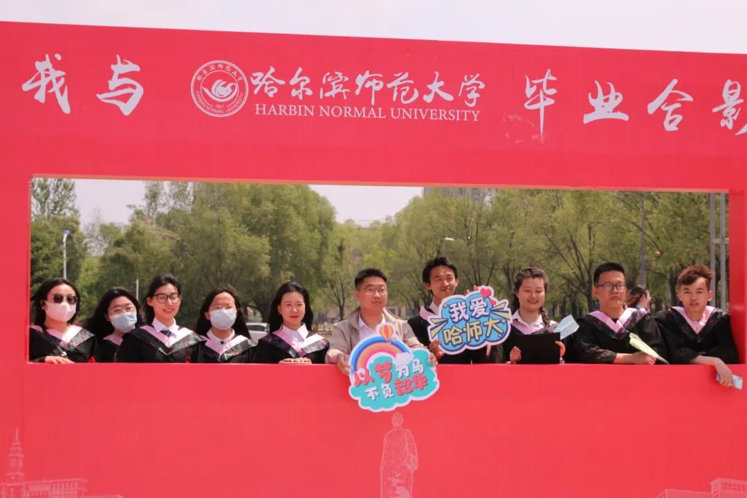 毕业生在背景板上为“我爱哈师大”涂色,把自己的手印按在背景板上。每个人的手掌都是独一无二的,按下手印,把自己独特的印记留在哈师大。