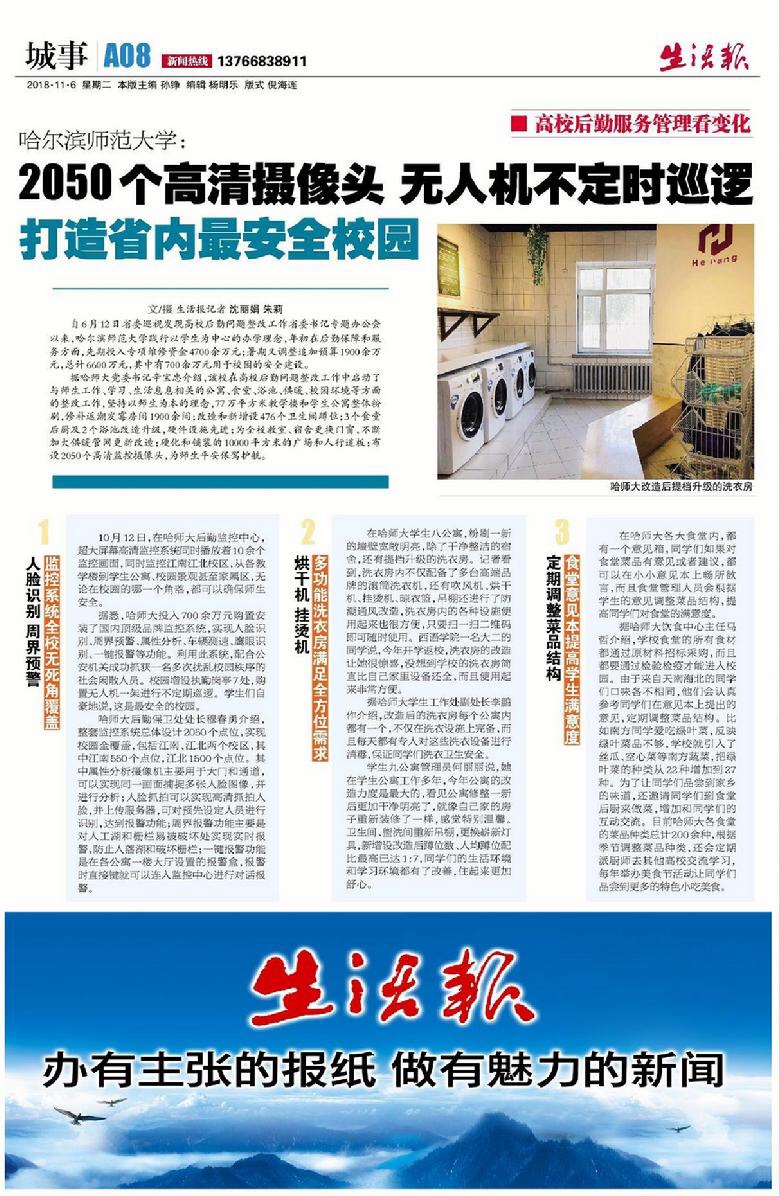 自6月12日省委巡视发现高校后勤问题整改工作省委书记专题办公会以来,哈尔滨师范大学践行以学生为中心的办学理念,年初在后勤保障和服务方面,先期投入专项维修资金4700余万元;暑期又调整追加预算1900余万元,总计6600万元,其中有700余万元用于校园的安全建设。