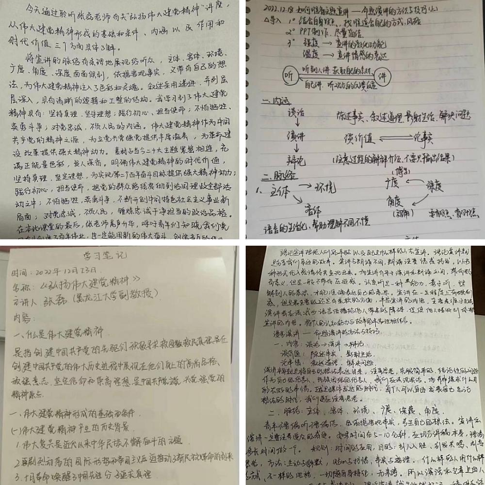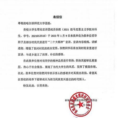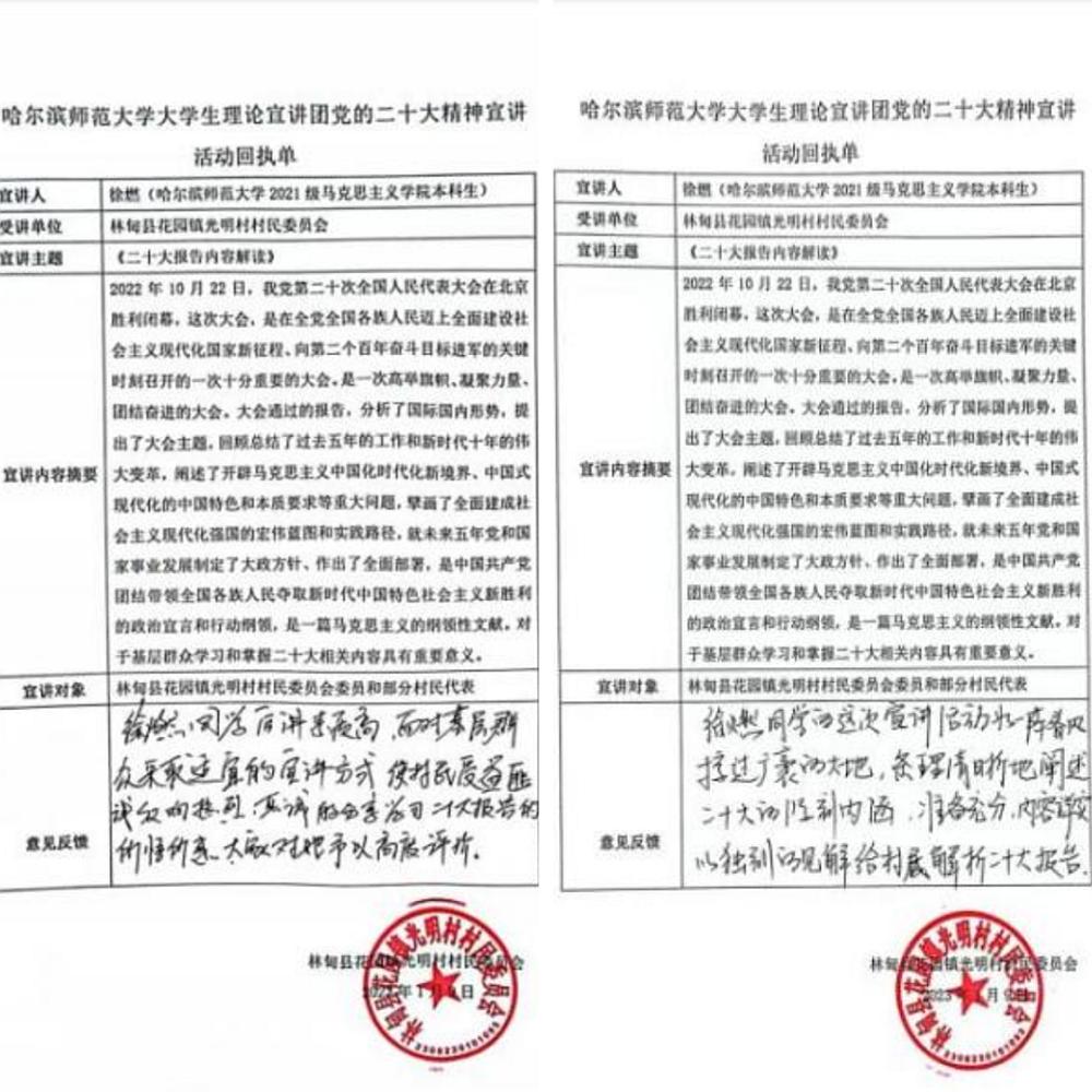 1月6日,宣讲团成员刘橦向黑龙江省齐齐哈尔市龙沙小学的学生家长作题为《办好人民满意的教育》的宣讲;1月9日,宣讲团成员徐燃向大庆市林甸县花园镇光明村村民作题为《党的二十大报告内容解读》的宣讲;1月10日,宣讲团成员杜思蕙、李佳薇、李欣悦、王玺分别向辽宁省葫芦岛市五里河社区居民、黑龙江省虎林市铁南社区居民、呼伦贝尔市莫力达瓦达斡尔族自治旗腾克镇西也必奇村村民、黑龙江省伊春市乌翠区乌马河街道居民作题为《读报告,悟思想:学习领会全过程人民民主》的宣讲;1月11日,宣讲团成员王心宇向黑龙江省齐齐哈尔市建华区黎明村村民作题为《全面推进乡村振兴》的宣讲。