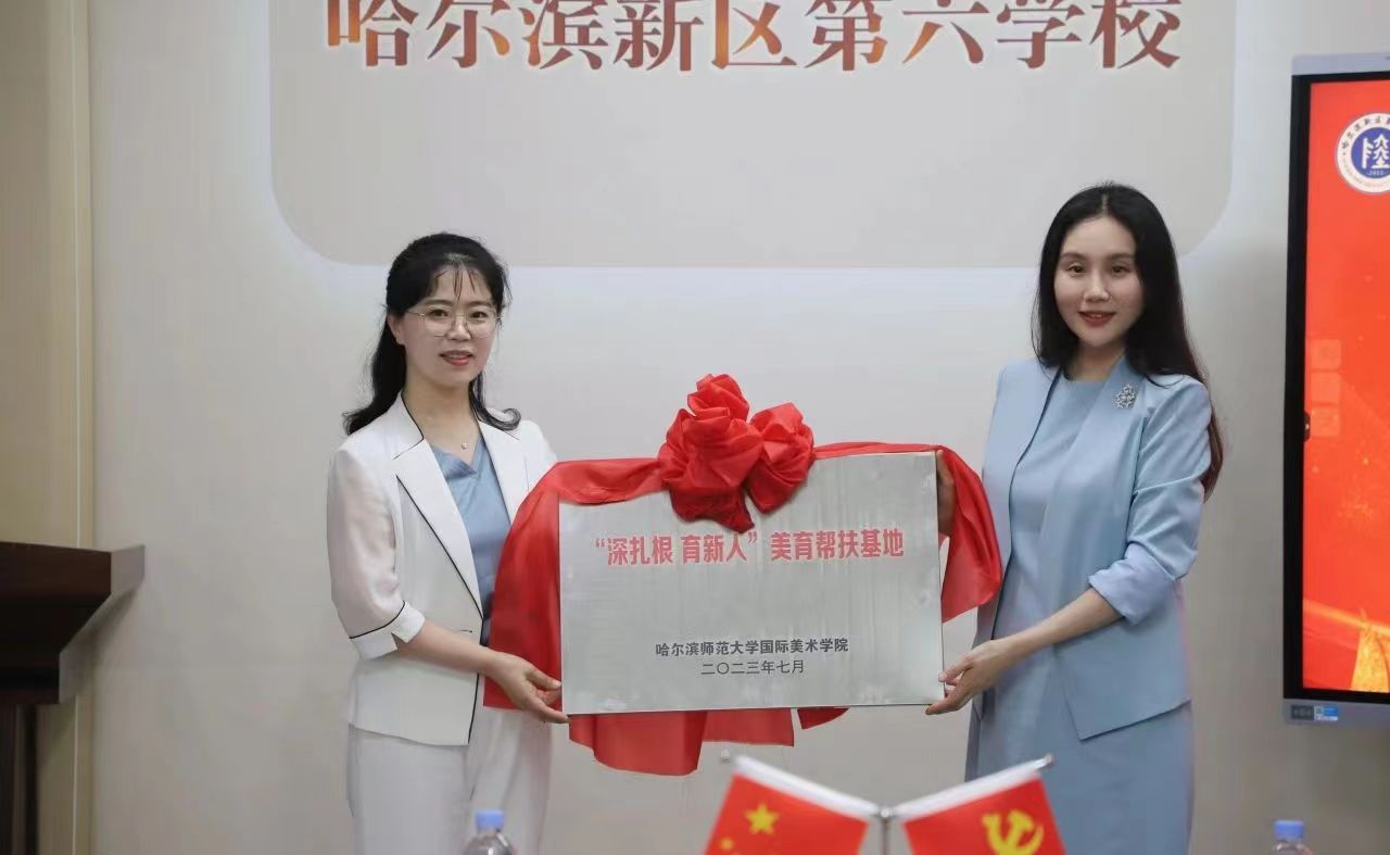 李卓为哈尔滨新区第六学校进行授牌。国际美术学院“深扎根,育新人”美育帮扶项目正式在哈尔滨新区第六学校落地。