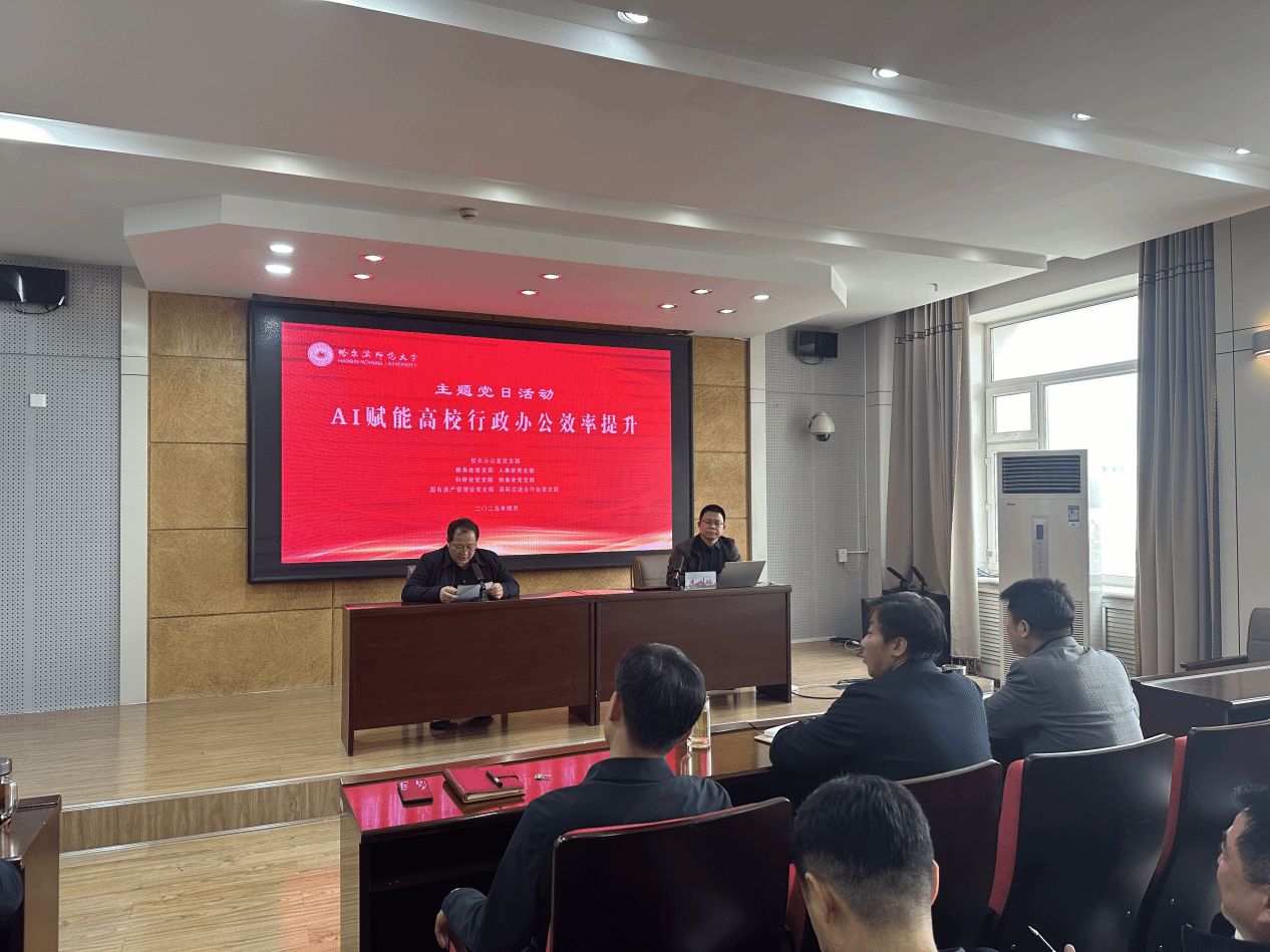 为积极响应国家教育数字化战略行动的号召,进一步推动人工智能技术在高校行政管理领域的深度融合与应用,切实提升行政办公效率和数字化管理水平,4月23日下午,校长办公室党支部、教务处党支部、人事处党支部、科研处党支部、财务处党支部、国有资产管理处党支部以及国际交流合作处党支部等七个党支部联合举办题为“AI赋能高校行政办公效率提升”的主题党日活动。