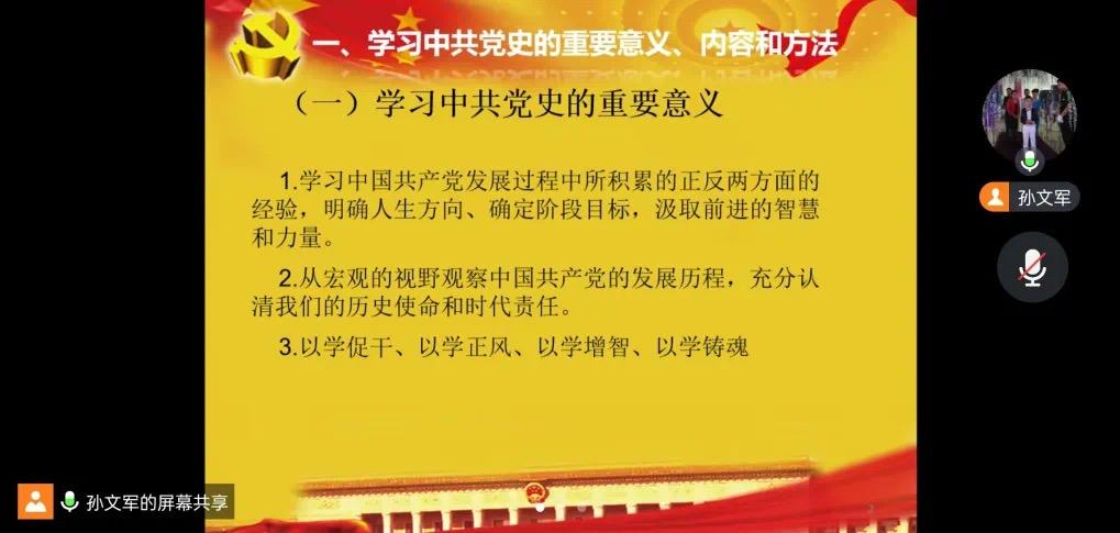 副院长孙文军以《重温中国共产党党史》为题,面向所在支部全体党员讲授专题党课,从中国共产党历史事件引入,总结了中国共产党一百多年历史的启示,强调了学习中共党史的重要意义、内容和方法。