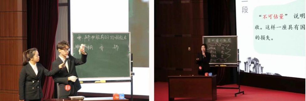 决赛现场,选手根据所选课程进行8分钟模拟授课,20名学生演员参与模拟互动。授课中,选手们准备了精致的教具和精美的ppt展示,用工整的板书和深入浅出的语言展现了一堂堂精心设计的课堂教学内容。赢得了评委和观众们的阵阵掌声,展现了我校未来教师们扎实的教学基本功,呈现了一场高标准高质量的盛会。