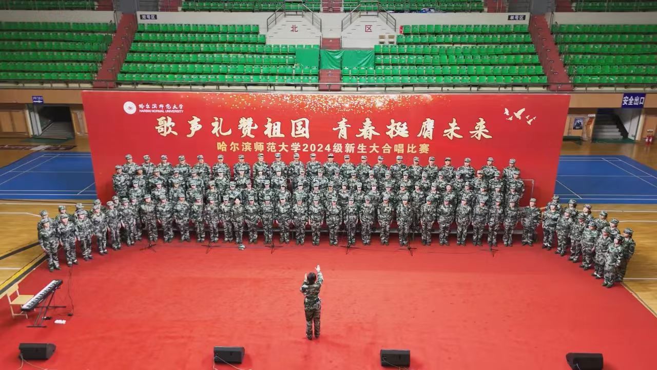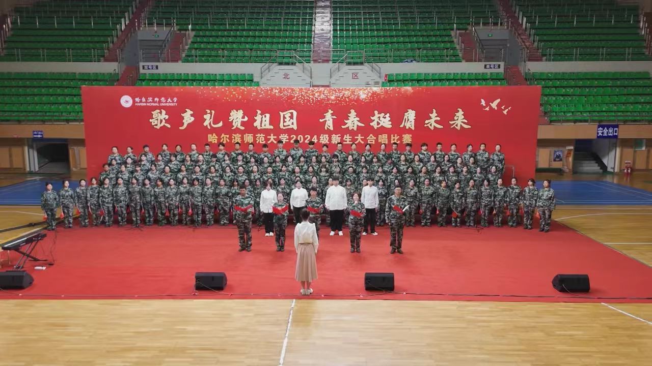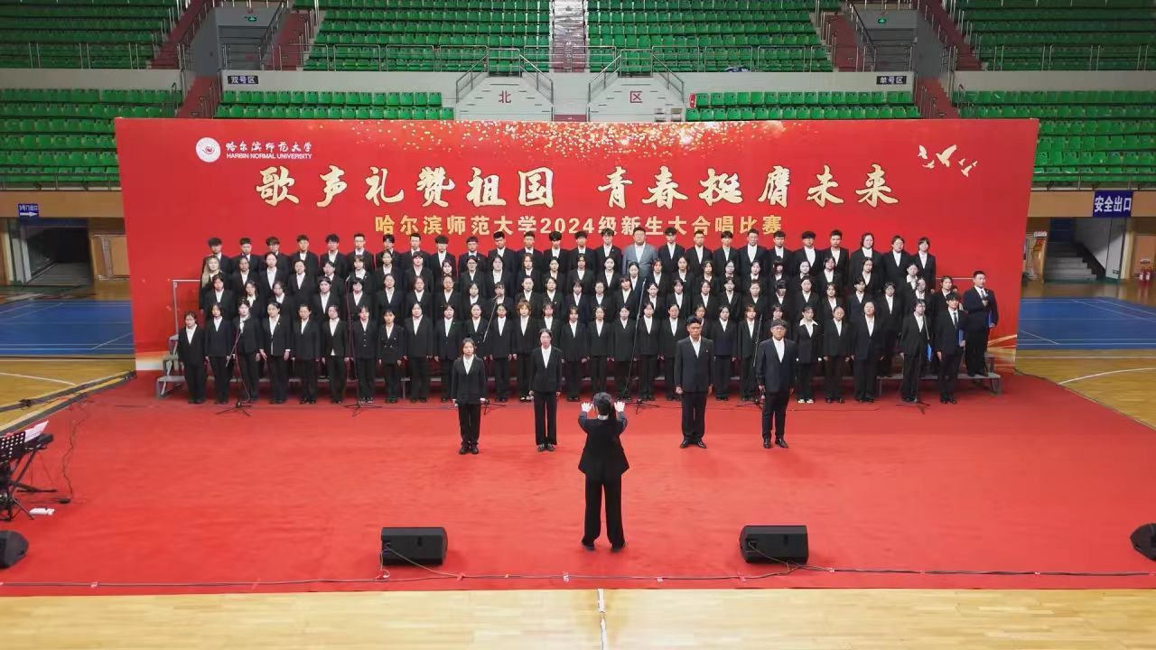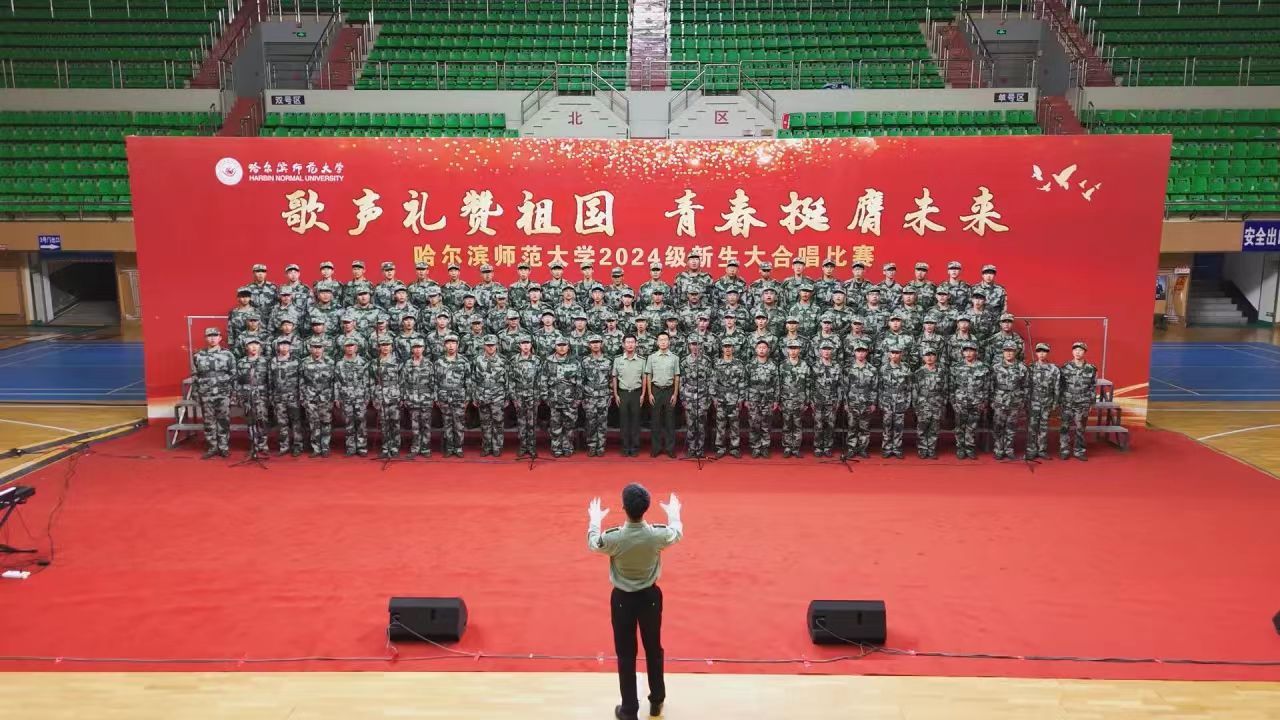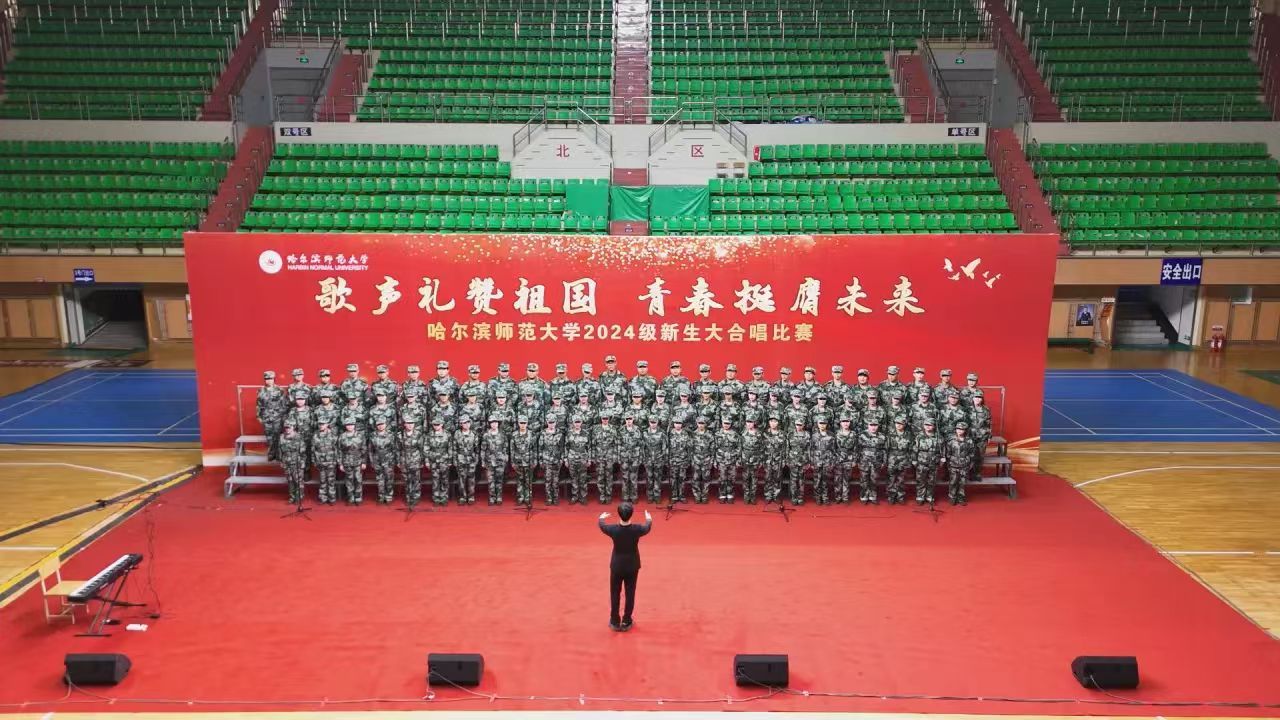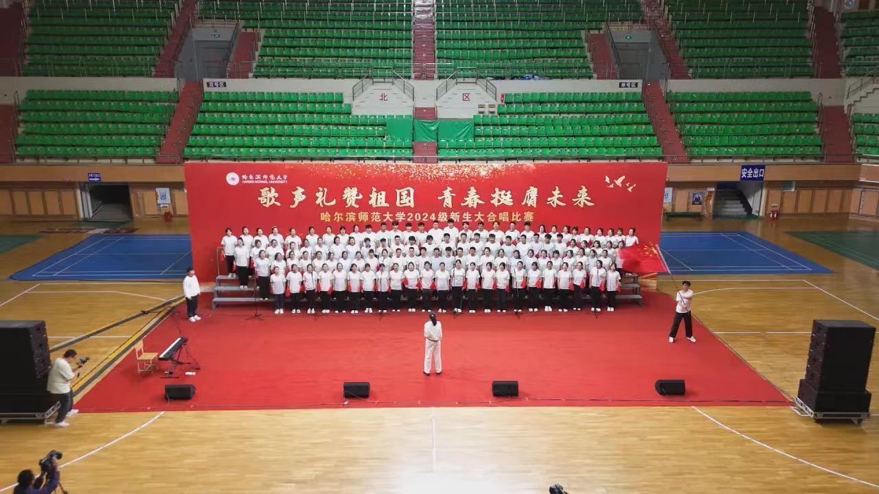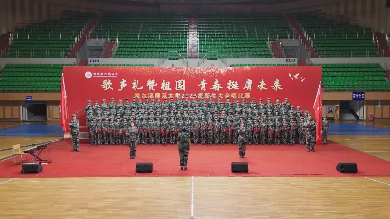 为深入学习宣传贯彻党的二十大精神,贯彻落实习近平总书记关于青年工作的重要思想,切实深化集体主义、爱国主义、社会主义教育,引领广大青年学生不断增强做中国人的志气、骨气、底气,以昂扬向上的精神风貌献礼中华人民共和国75周年华诞,奋力书写为中国式现代化挺膺担当的青春篇章,我校学生工作部(学生处、武装部)、团委在军训期间联合举办了“歌声礼赞祖国 青春挺膺未来”庆祝中华人民共和国成立75周年2024级新生大合唱比赛。9月19日,合唱比赛在江北校区体育馆和江南校区体育场举行,比赛现场歌声嘹亮,气势澎湃,精彩纷呈,20支参赛队伍用铿锵激昂的歌声,展现了哈师大学子锐意进取、昂扬向上的精神面貌。