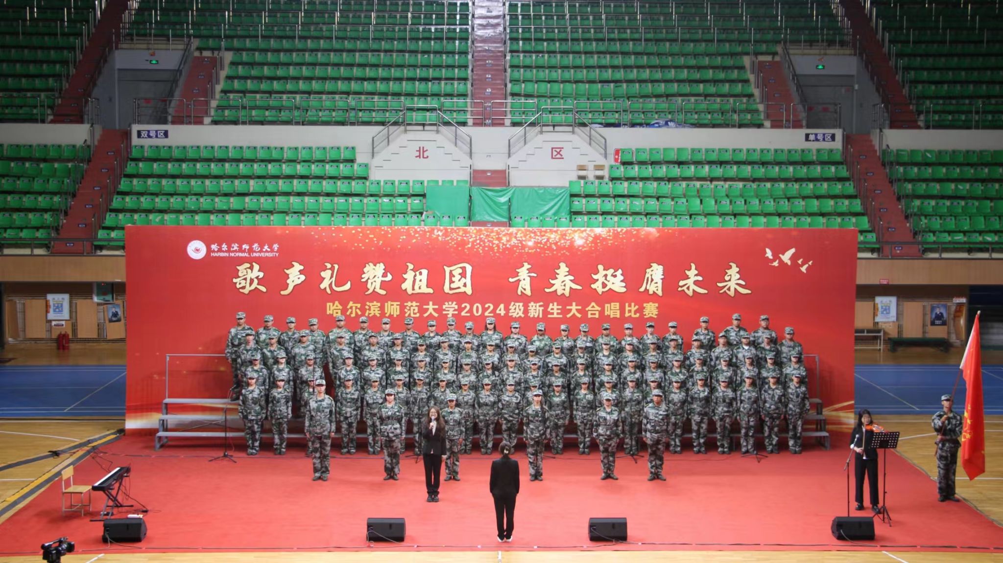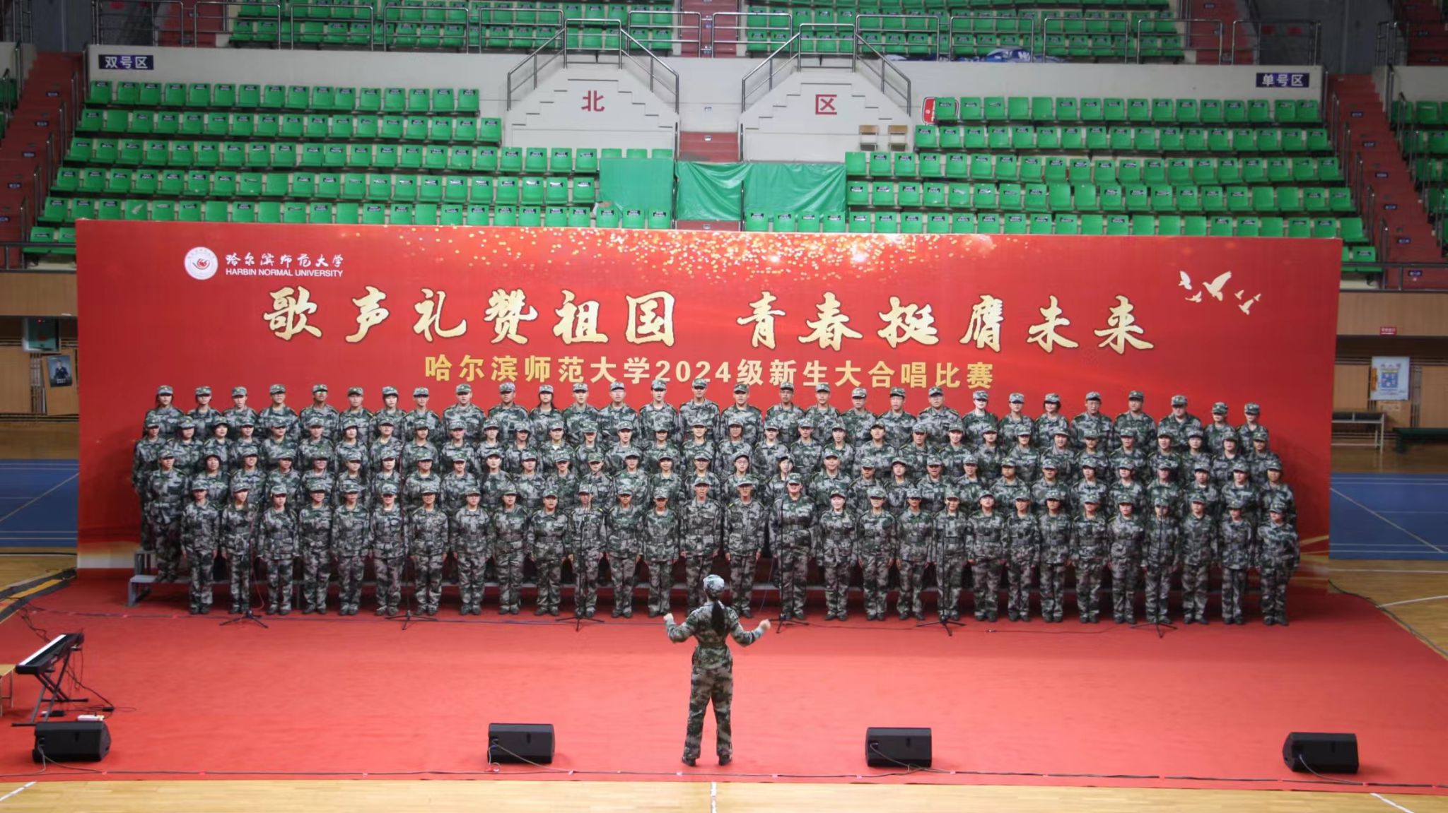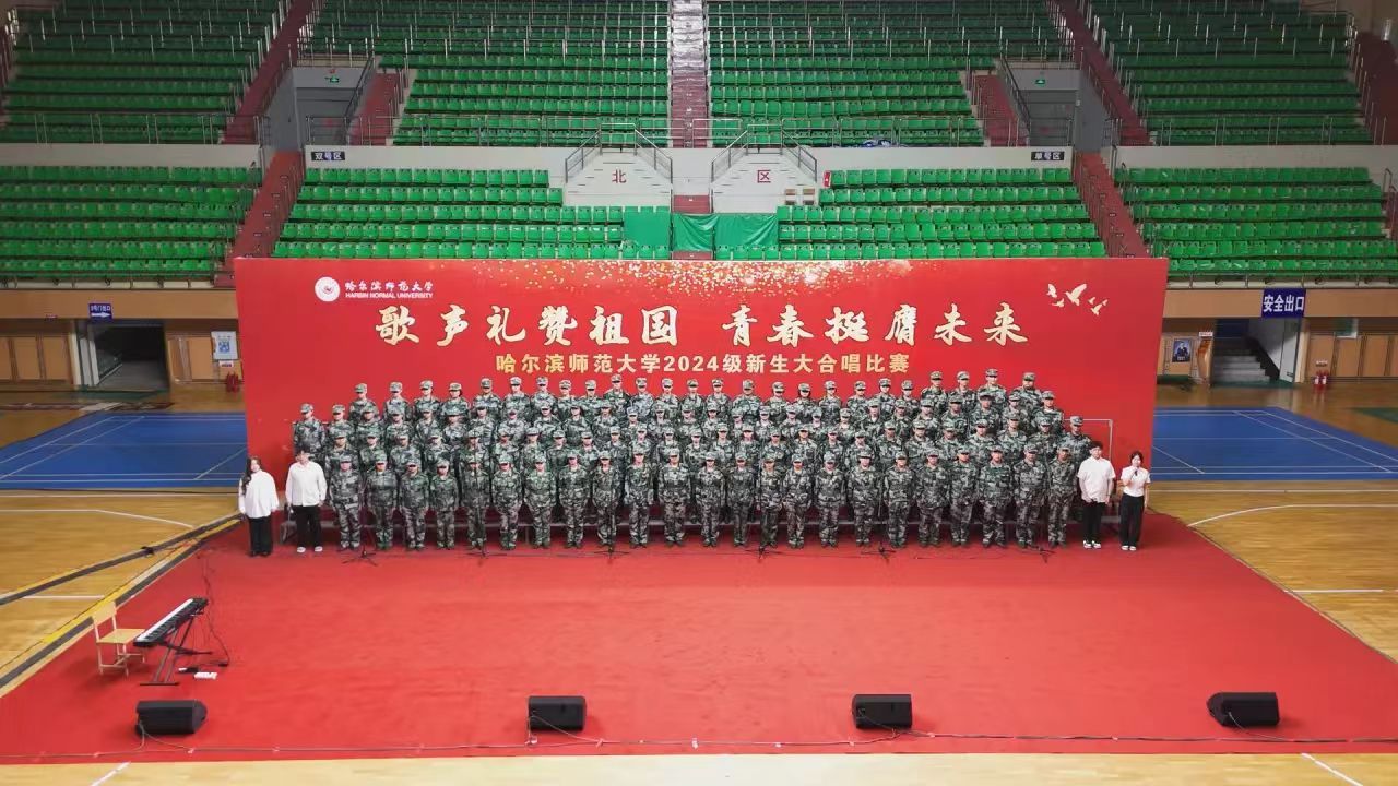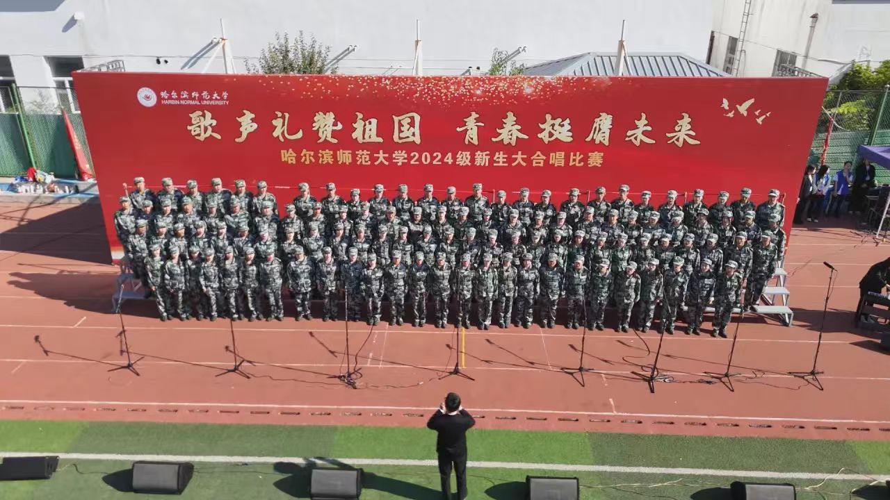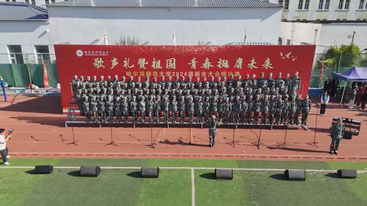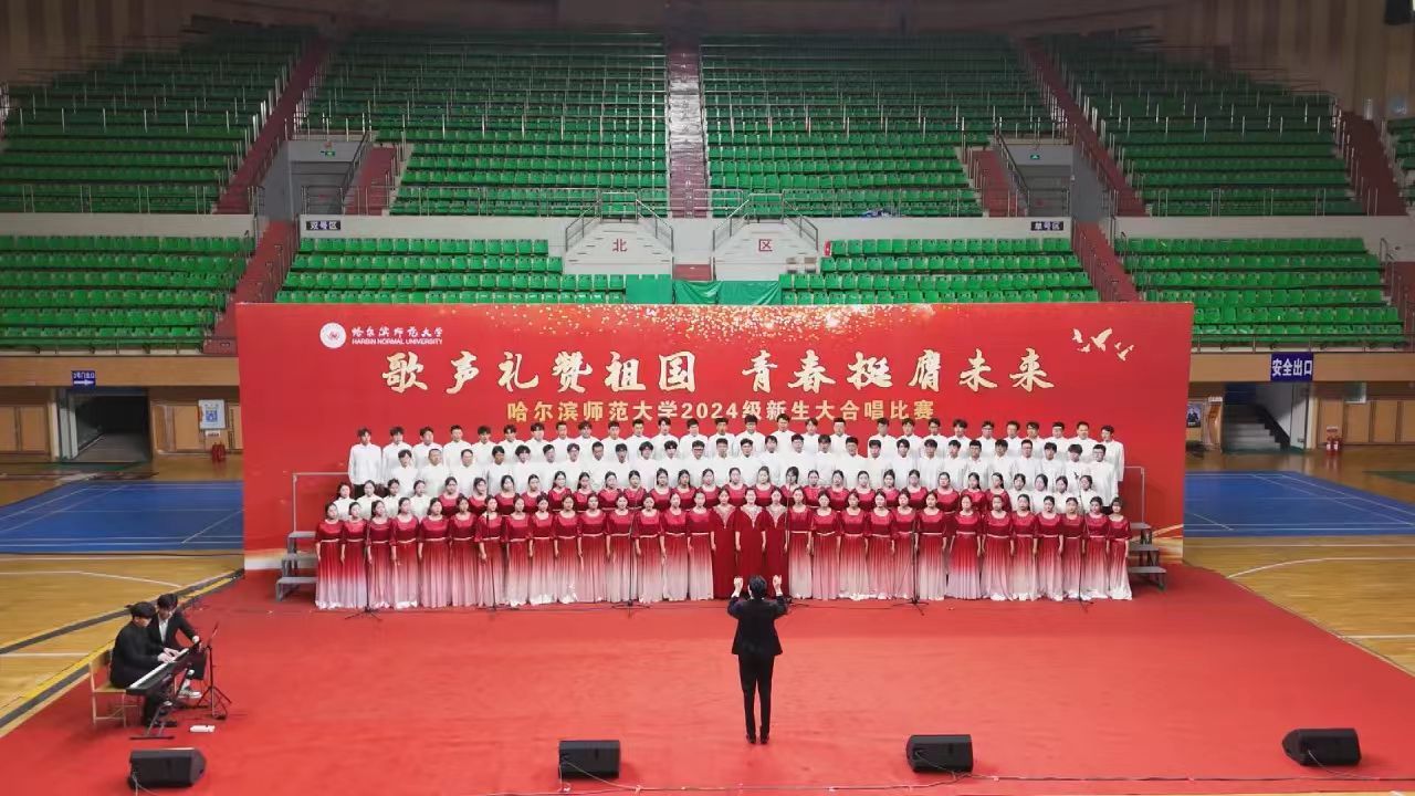 为深入学习宣传贯彻党的二十大精神,贯彻落实习近平总书记关于青年工作的重要思想,切实深化集体主义、爱国主义、社会主义教育,引领广大青年学生不断增强做中国人的志气、骨气、底气,以昂扬向上的精神风貌献礼中华人民共和国75周年华诞,奋力书写为中国式现代化挺膺担当的青春篇章,我校学生工作部(学生处、武装部)、团委在军训期间联合举办了“歌声礼赞祖国 青春挺膺未来”庆祝中华人民共和国成立75周年2024级新生大合唱比赛。9月19日,合唱比赛在江北校区体育馆和江南校区体育场举行,比赛现场歌声嘹亮,气势澎湃,精彩纷呈,20支参赛队伍用铿锵激昂的歌声,展现了哈师大学子锐意进取、昂扬向上的精神面貌。