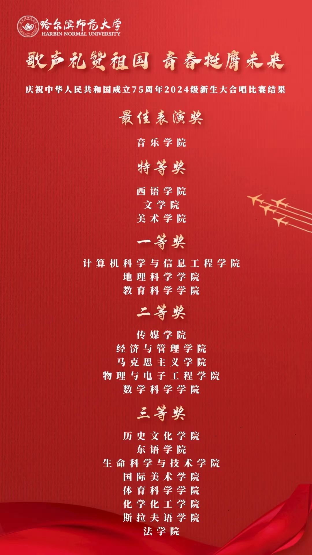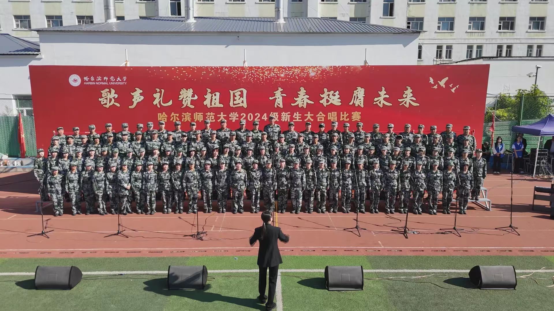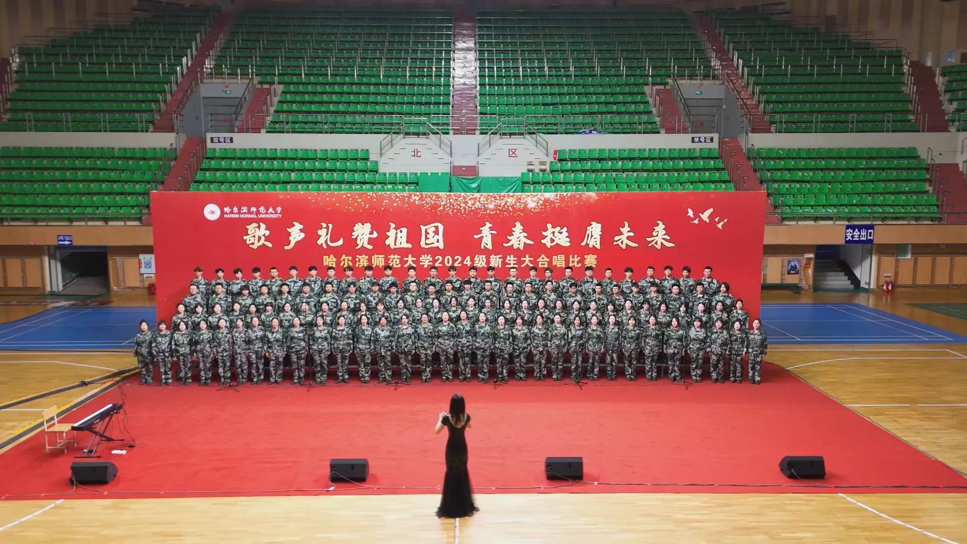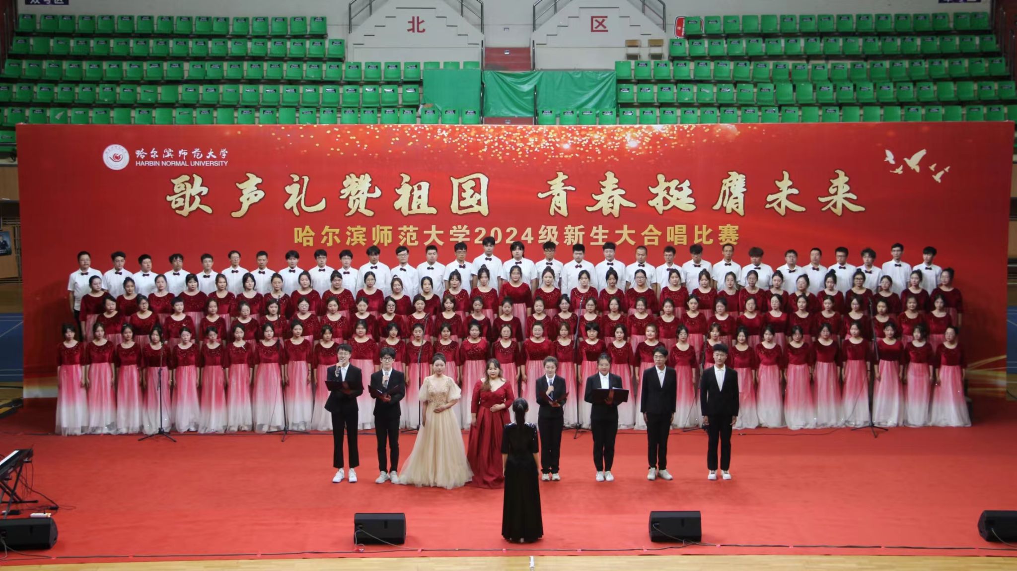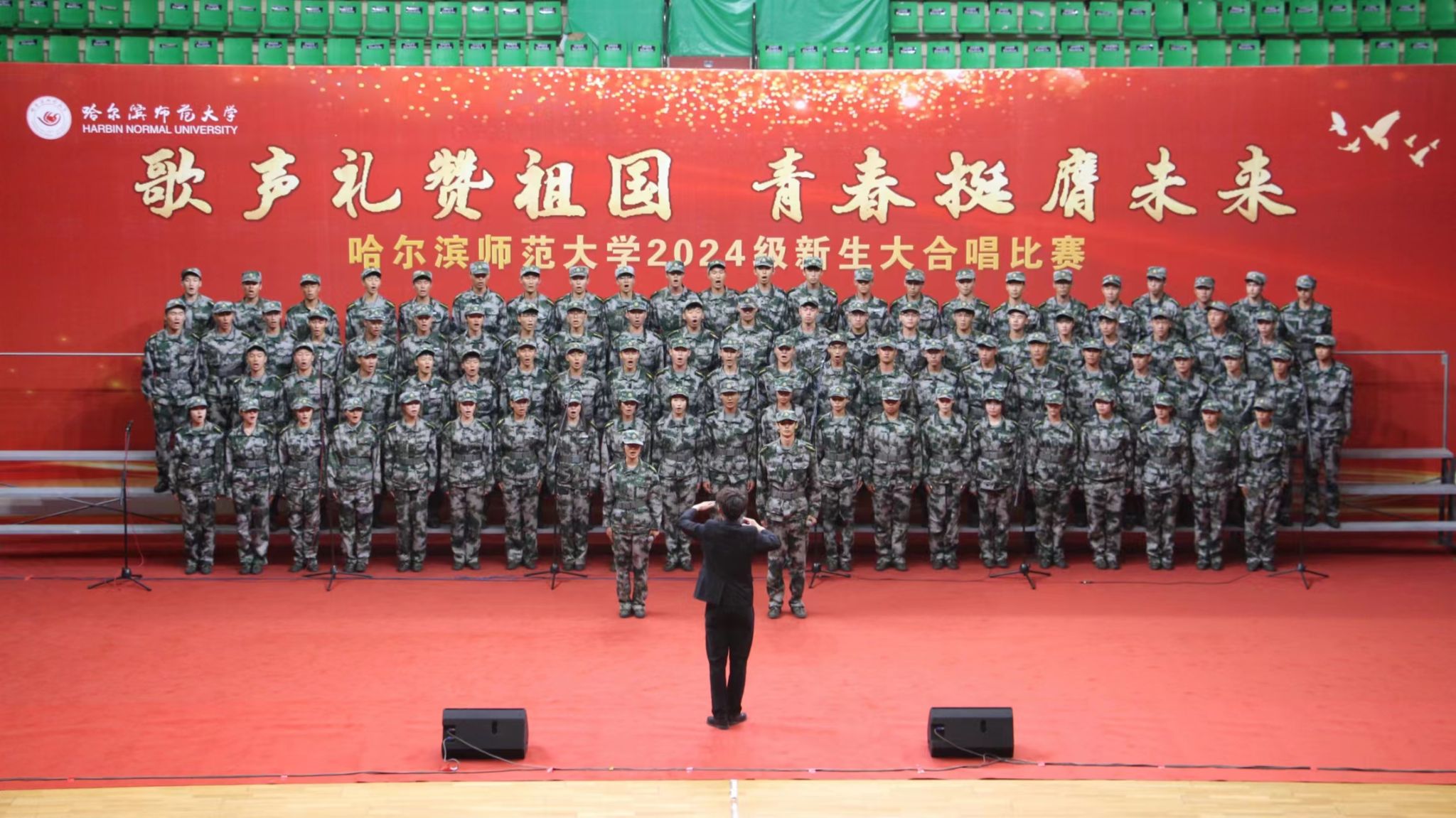 为深入学习宣传贯彻党的二十大精神,贯彻落实习近平总书记关于青年工作的重要思想,切实深化集体主义、爱国主义、社会主义教育,引领广大青年学生不断增强做中国人的志气、骨气、底气,以昂扬向上的精神风貌献礼中华人民共和国75周年华诞,奋力书写为中国式现代化挺膺担当的青春篇章,我校学生工作部(学生处、武装部)、团委在军训期间联合举办了“歌声礼赞祖国 青春挺膺未来”庆祝中华人民共和国成立75周年2024级新生大合唱比赛。9月19日,合唱比赛在江北校区体育馆和江南校区体育场举行,比赛现场歌声嘹亮,气势澎湃,精彩纷呈,20支参赛队伍用铿锵激昂的歌声,展现了哈师大学子锐意进取、昂扬向上的精神面貌。