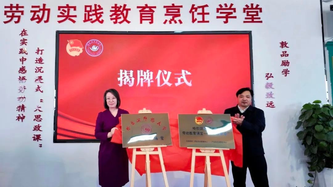 郭砾、尹剑锋为“哈尔滨师范大学劳动教育课堂”和“烹饪学堂”揭牌