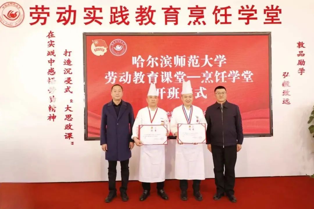 开班仪式上,校党委副书记、工会主席郭砾,党委常委、副校长尹剑锋为“哈尔滨师范大学劳动教育课堂”和“烹饪学堂”揭牌。产业处党委书记刘春秀、处长穆春勇为培训班讲师代表颁发聘书。