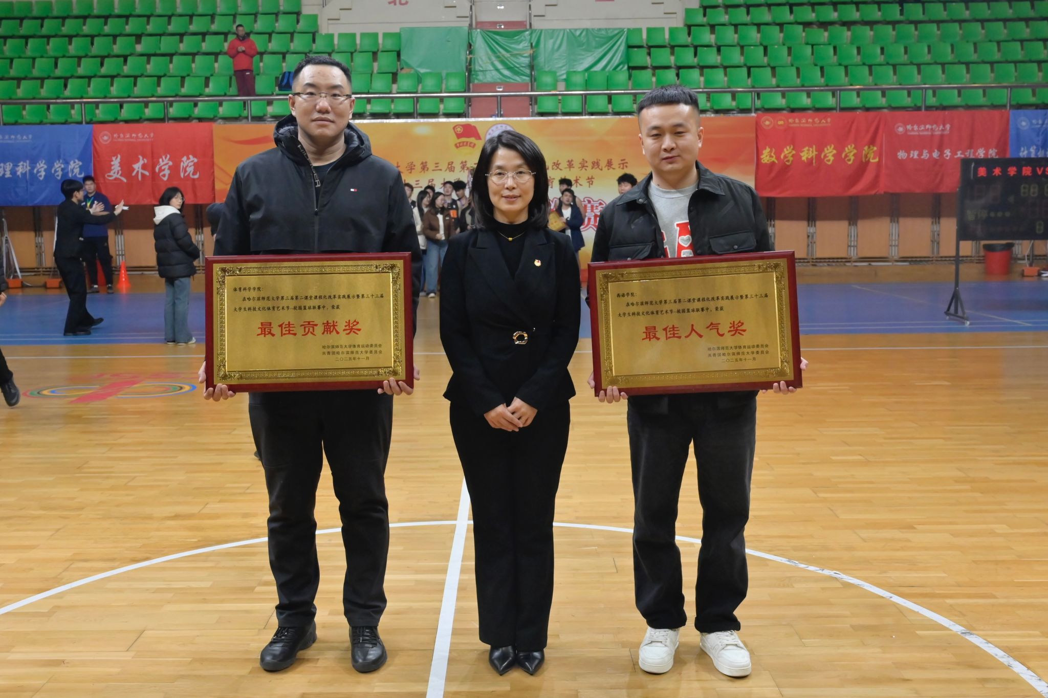 校团委书记刘春玲为最佳人气球队西语学院和最佳贡献奖体育科学学院颁奖