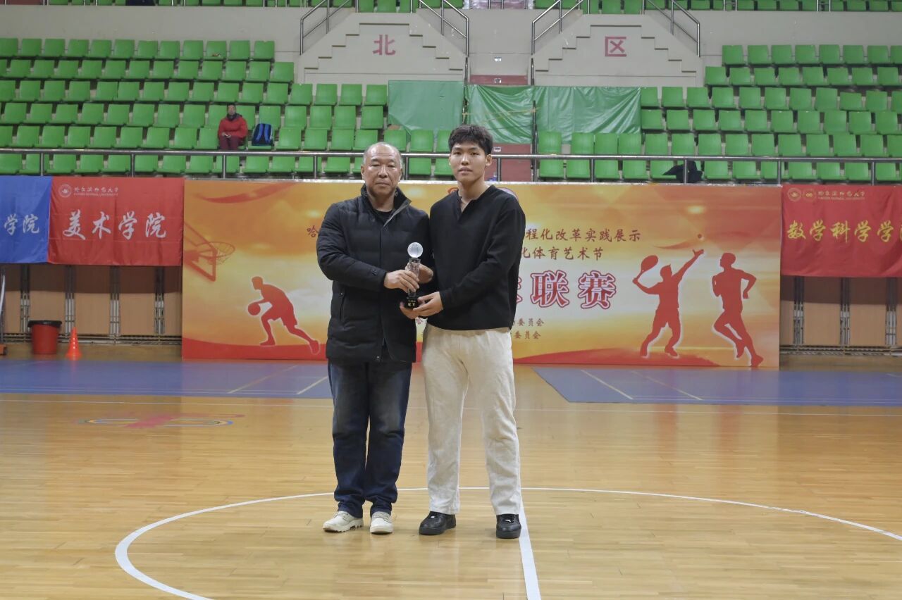 体育科学学院党委副书记、正处级辅导员冯铁南为三分投篮大赛冠军颁奖