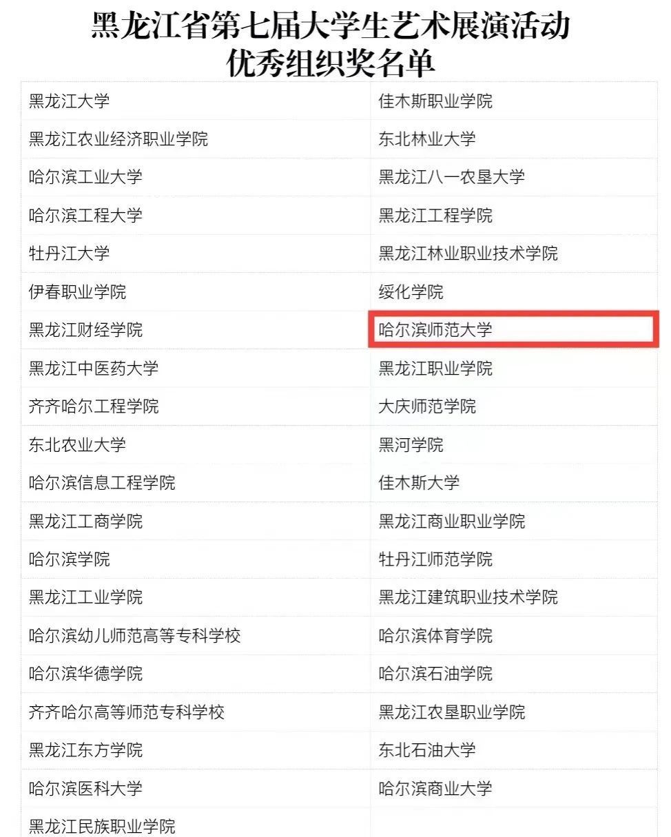 近日,2023年黑龙江省第七届大学生艺术展演活动成绩揭晓。经专家评审,我校获得艺术表演奖一等奖14项、二等奖10项、三等奖4项,学生艺术作品奖一等奖6项、二等奖5项、三等奖4项,艺术实践工作坊一等奖1项、二等奖1项,高校美育改革创新优秀案例一等奖1项、二等奖1项、三等奖1项,我校获得优秀组织奖。