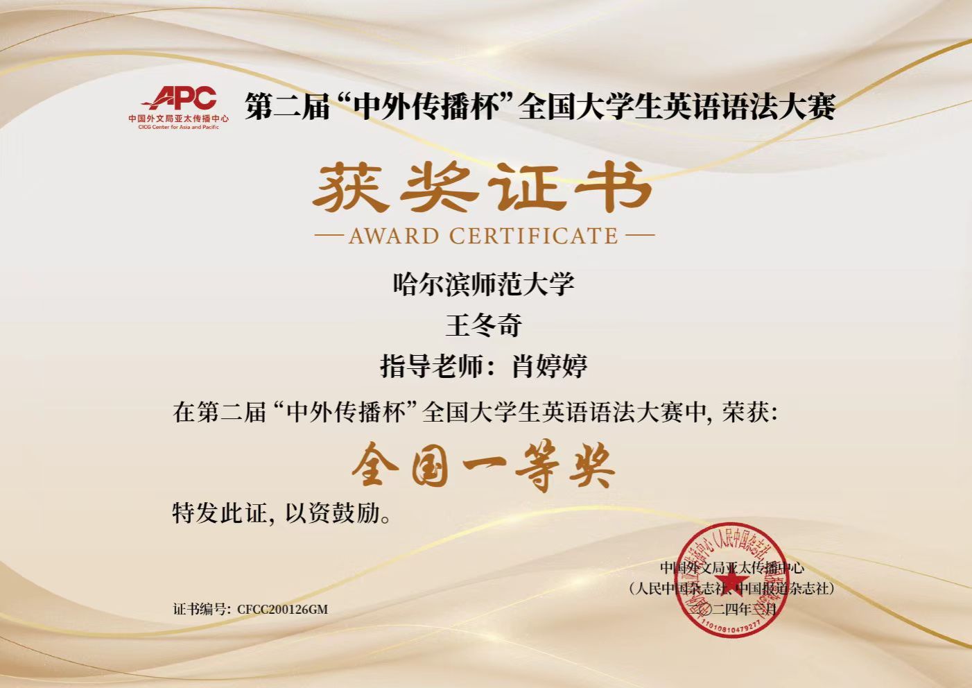 (徐伟伟/文)为深入贯彻中共中央、国务院《关于深化教育体制机制改革的意见》和教育部《关于加快建设高水平本科教育 全面提高人才培养能力的意见》等文件精神,配合教育部高等教育教学评估工作,落实教育部关于高等院校英语教学改革和考试与评价改革精神,培养高等院校在校学生的跨文化交流能力,推动国际化、复合型人才队伍建设。中国外文局亚太传播中心(人民中国杂志社、中国报道杂志社)特举办第二届“中外传播杯”全国大学生英语语法大赛。在比赛中,西语学院学生们展现出了扎实的语法功底,凭借出色的表现脱颖而出,斩获佳绩。赵紫彤等同学获得全国特等奖,王冬奇、尚志明、王艺诺等同学分别获得全国一、二、三等奖。