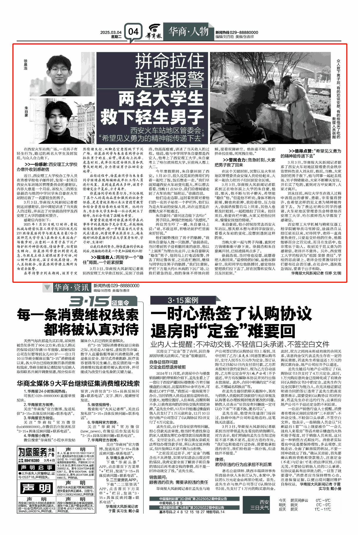 我校历史文化学院朱自豪与中学同学徐晨浩都是西安人,朱自豪考上了哈尔滨师范大学,徐晨浩考上了西安理工大学,目前两人都是大二。2024年寒假,朱自豪回到西安。2025年1月20日,很久没见面的俩哥们儿约着一起吃了饭,饭后想走一走。晚12时许,两人在西安火车站南广场散步时,注意到一名男子在下沉广场护栏外神情恍惚,情绪异常,似有轻生倾向。朱自豪与朋友主动上前跟该男子对话,耐心倾听其诉说,温言安抚其情绪。两人互相配合,朱自豪“稳住”局面,其朋友借上厕所为由前去报警。在等待警方到来期间,该男子突然情绪失控、双脚悬空意图跳下下沉广场。朱自豪同学与徐晨浩同学分别拉住男子的左、右臂,将其向上托举。危急时刻,巡逻安保队员和民警及时赶到,合力将该男子拉回安全地带。