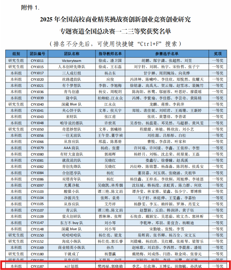 近日,2025年全国高校商业精英挑战赛创新创业竞赛创业研究专题赛道全国总决赛圆满落幕。经过多轮激烈角逐,我校经济与管理学院学子再创佳绩,共有5支队伍脱颖而出、斩获殊荣。由教师樊鸿禄、郭晓勋指导的“π计划组”获得本科组一等奖,由教师樊鸿禄指导的“逐梦航行者队”和教师李言睿指导的“吉祥三宝”获得本科组二等奖,由教师薛宏冰、陶楠指导的“606”获得研究生组二等奖,由教师牟向阳指导的 “智创未来”获得本科组三等奖。