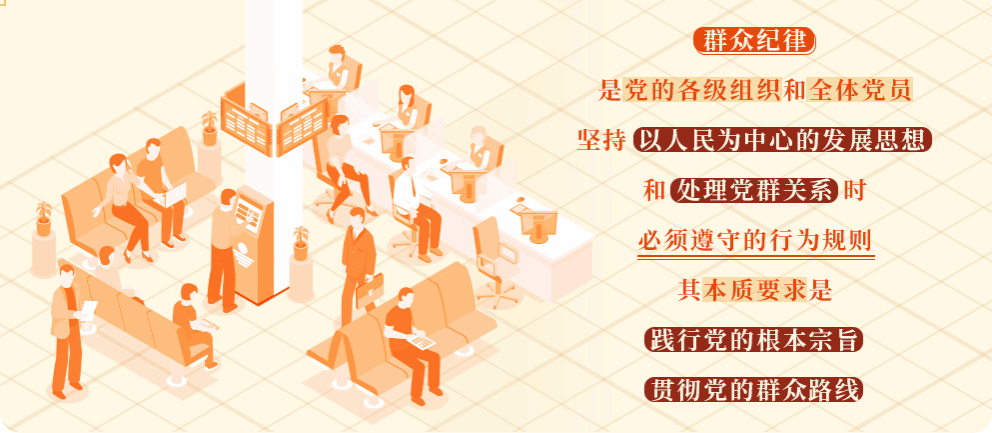 群众纪律是党的各级组织和全体党员坚持以人民为中心的发展思想和处理党群关系时必须遵守的行为规则,其本质要求是践行党的根本宗旨,贯彻党的群众路线。 违反群众纪律的行为主要包括以下几类:侵害群众利益;民生保障显失公平;涉黑涉恶欺压群众;漠视群众利益;侵犯群众知情权等。