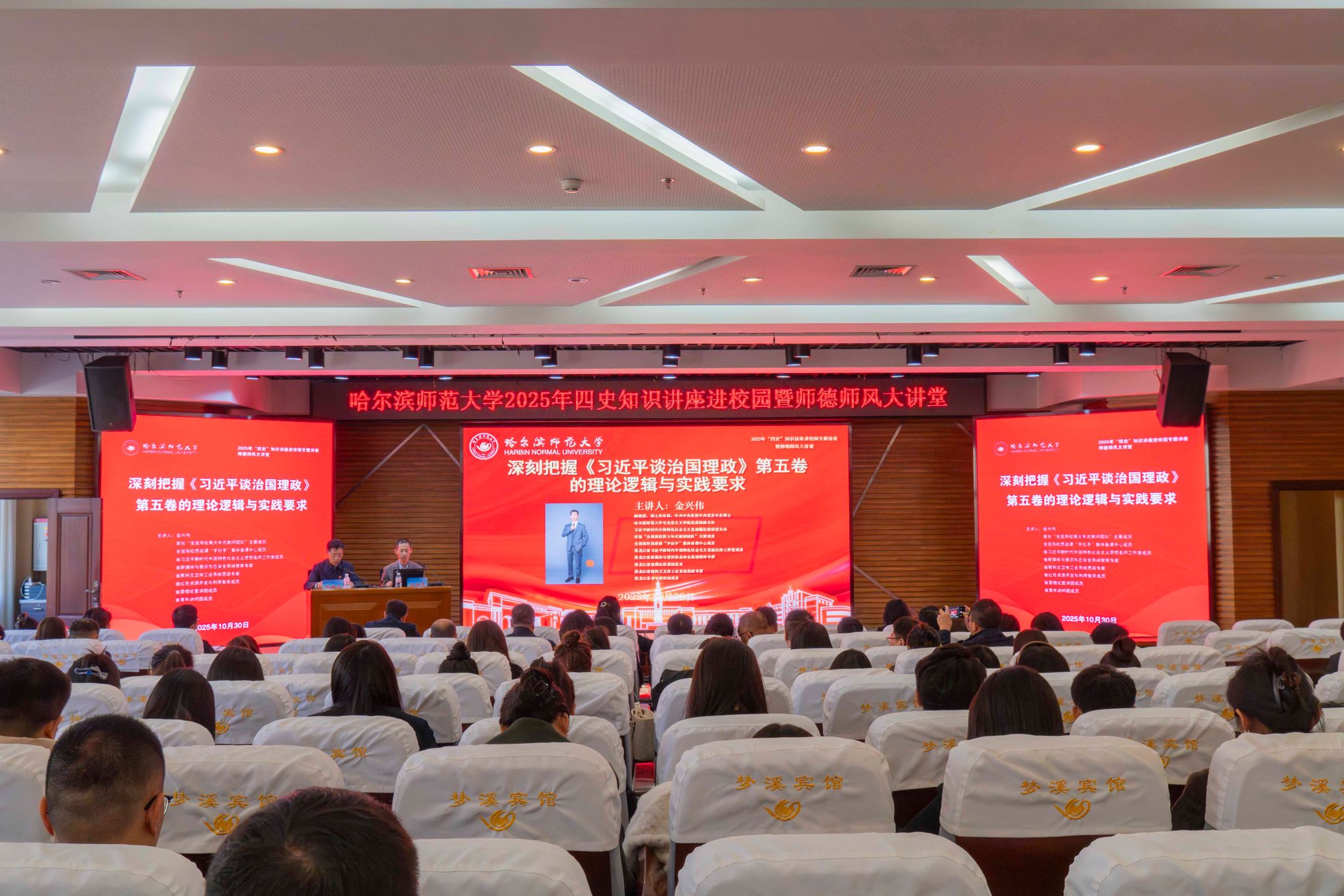 10月30日上午,校工会联合党委宣传部(教师工作部)在主校区梦溪宾馆二楼报告厅成功举办“四史”知识进校园专题讲座暨师德师风大讲堂。校工会常务副主席杨世君主持讲座,校工会及党委宣传部(教师工作部)、党委办公室全体干部,各基层工会委员会全体委员、全体新入职教师、经济与管理学院学生党员及各学院教职工代表共三百余人参会。本次讲座特别邀请省总工会“四史进校园”宣讲团成员、我校马克思主义学院副教授金兴伟担任主讲嘉宾。...